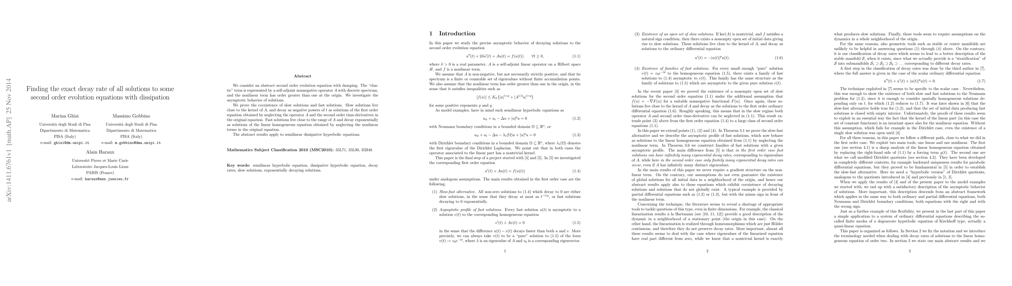 We consider an abstract second order evolution equation with damping. The "elastic" term is represented by a self-adjoint nonnegative operator A with discrete spectrum, and the nonlinear term has order greater than one at the origin. We investigate the asymptotic behavior of solutions. We prove the coexistence of slow solutions and fast solutions. Slow solutions live close to the kernel of A, and decay as negative powers of t as solutions of the first order equation obtained by neglecting the operator A and the second order time-derivatives in the original equation. Fast solutions live close to the range of A and decay exponentially as solutions of the linear homogeneous equation obtained by neglecting the nonlinear terms in the original equation. The abstract results apply to semilinear dissipative hyperbolic equations.
