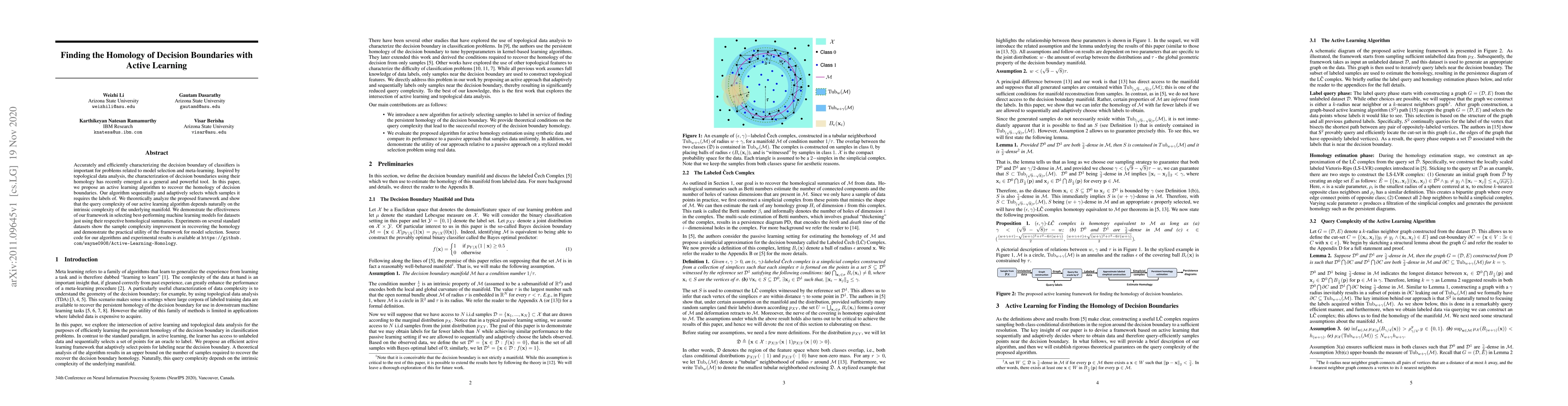 Accurately and efficiently characterizing the decision boundary of classifiers is important for problems related to model selection and meta-learning. Inspired by topological data analysis, the characterization of decision boundaries using their homology has recently emerged as a general and powerful tool. In this paper, we propose an active learning algorithm to recover the homology of decision boundaries. Our algorithm sequentially and adaptively selects which samples it requires the labels of. We theoretically analyze the proposed framework and show that the query complexity of our active learning algorithm depends naturally on the intrinsic complexity of the underlying manifold. We demonstrate the effectiveness of our framework in selecting best-performing machine learning models for datasets just using their respective homological summaries. Experiments on several standard datasets show the sample complexity improvement in recovering the homology and demonstrate the practical utility of the framework for model selection. Source code for our algorithms and experimental results is available at https://github.com/wayne0908/Active-Learning-Homology.