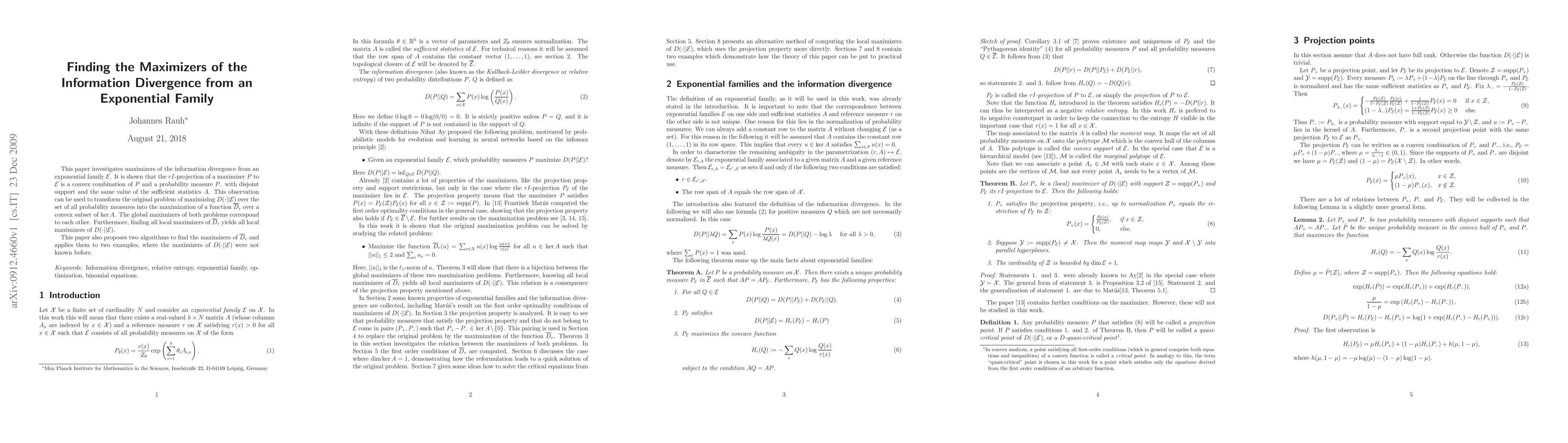 This paper investigates maximizers of the information divergence from an exponential family $E$. It is shown that the $rI$-projection of a maximizer $P$ to $E$ is a convex combination of $P$ and a probability measure $P_-$ with disjoint support and the same value of the sufficient statistics $A$. This observation can be used to transform the original problem of maximizing $D(\cdot||E)$ over the set of all probability measures into the maximization of a function $\Dbar$ over a convex subset of $\ker A$. The global maximizers of both problems correspond to each other. Furthermore, finding all local maximizers of $\Dbar$ yields all local maximizers of $D(\cdot||E)$. This paper also proposes two algorithms to find the maximizers of $\Dbar$ and applies them to two examples, where the maximizers of $D(\cdot||E)$ were not known before.
