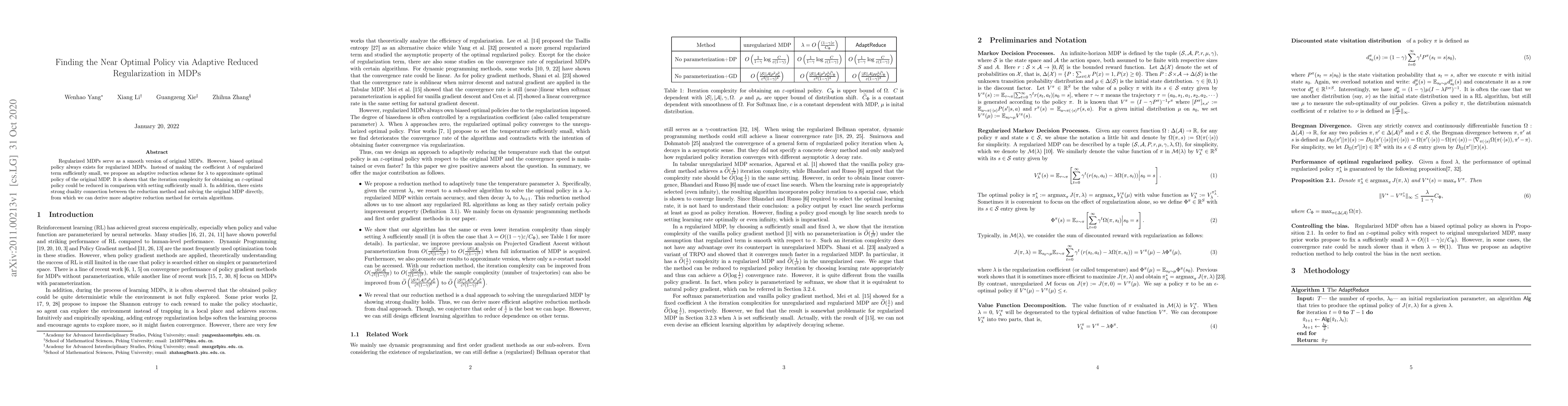 Regularized MDPs serve as a smooth version of original MDPs. However, biased optimal policy always exists for regularized MDPs. Instead of making the coefficient{\lambda}of regularized term sufficiently small, we propose an adaptive reduction scheme for {\lambda} to approximate optimal policy of the original MDP. It is shown that the iteration complexity for obtaining an{\epsilon}-optimal policy could be reduced in comparison with setting sufficiently small{\lambda}. In addition, there exists strong duality connection between the reduction method and solving the original MDP directly, from which we can derive more adaptive reduction method for certain algorithms.