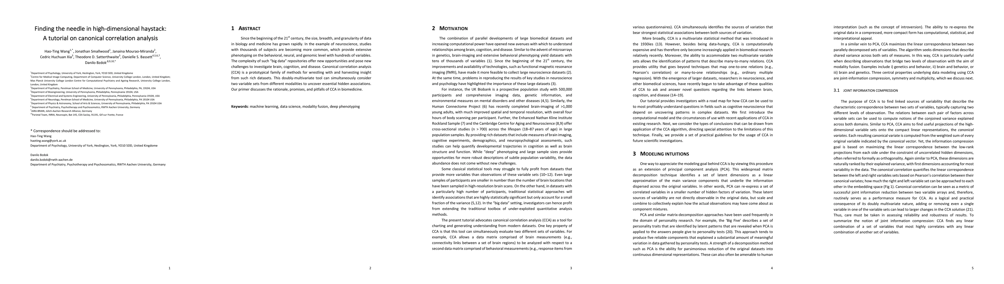 Since the beginning of the 21st century, the size, breadth, and granularity of data in biology and medicine has grown rapidly. In the example of neuroscience, studies with thousands of subjects are becoming more common, which provide extensive phenotyping on the behavioral, neural, and genomic level with hundreds of variables. The complexity of such big data repositories offer new opportunities and pose new challenges to investigate brain, cognition, and disease. Canonical correlation analysis (CCA) is a prototypical family of methods for wrestling with and harvesting insight from such rich datasets. This doubly-multivariate tool can simultaneously consider two variable sets from different modalities to uncover essential hidden associations. Our primer discusses the rationale, promises, and pitfalls of CCA in biomedicine.