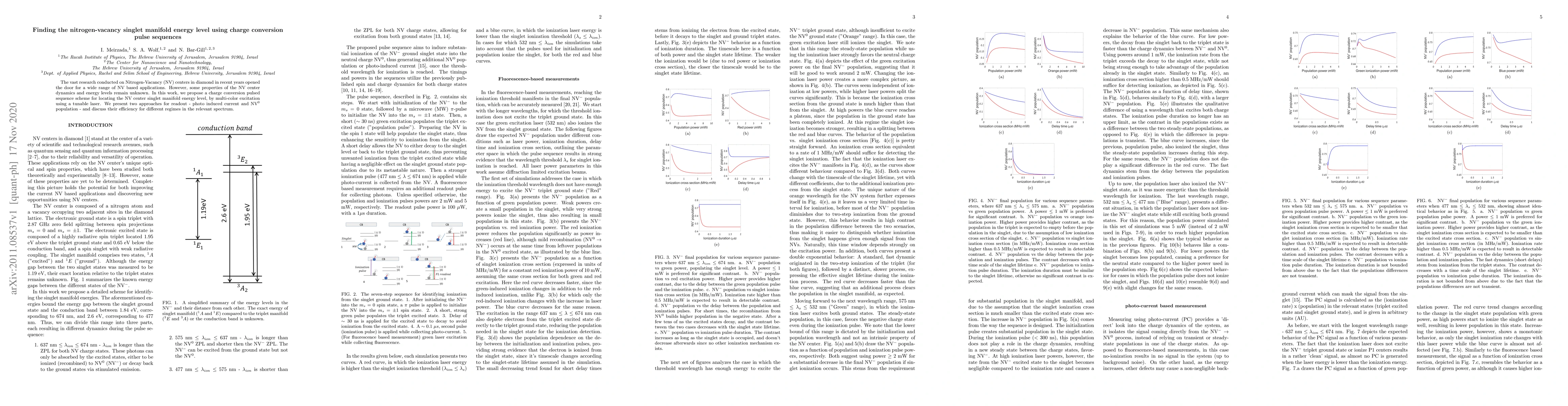 The vast research conducted on Nitrogen-Vacancy (NV) centers in diamond in recent years opened the door for a wide range of NV based applications. However, some properties of the NV center dynamics and energy levels remain unknown. In this work, we propose a charge conversion pulsed sequence scheme for locating the NV center singlet manifold energy level, by multi-color excitation using a tunable laser. We present two approaches for readout - photo-induced current and NV$^0$ population - and discuss their efficiency for different regimes in the relevant spectrum.