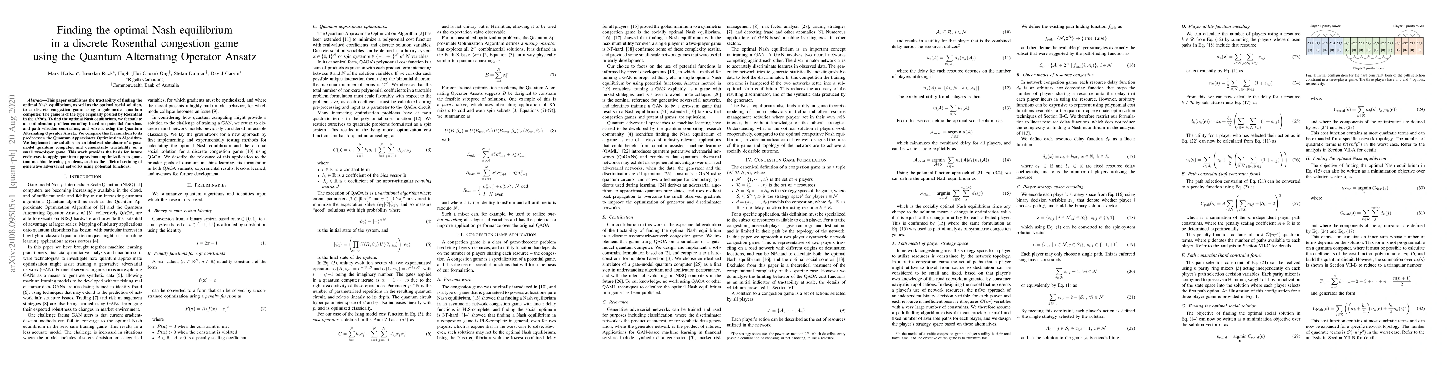 This paper establishes the tractability of finding the optimal Nash equilibrium, as well as the optimal social solution, to a discrete congestion game using a gate-model quantum computer. The game is of the type originally posited by Rosenthal in the 1970's. To find the optimal Nash equilibrium, we formulate an optimization problem encoding based on potential functions and path selection constraints, and solve it using the Quantum Alternating Operator Ansatz. We compare this formulation to its predecessor, the Quantum Approximate Optimization Algorithm. We implement our solution on an idealized simulator of a gate-model quantum computer, and demonstrate tractability on a small two-player game. This work provides the basis for future endeavors to apply quantum approximate optimization to quantum machine learning problems, such as the efficient training of generative adversarial networks using potential functions.
