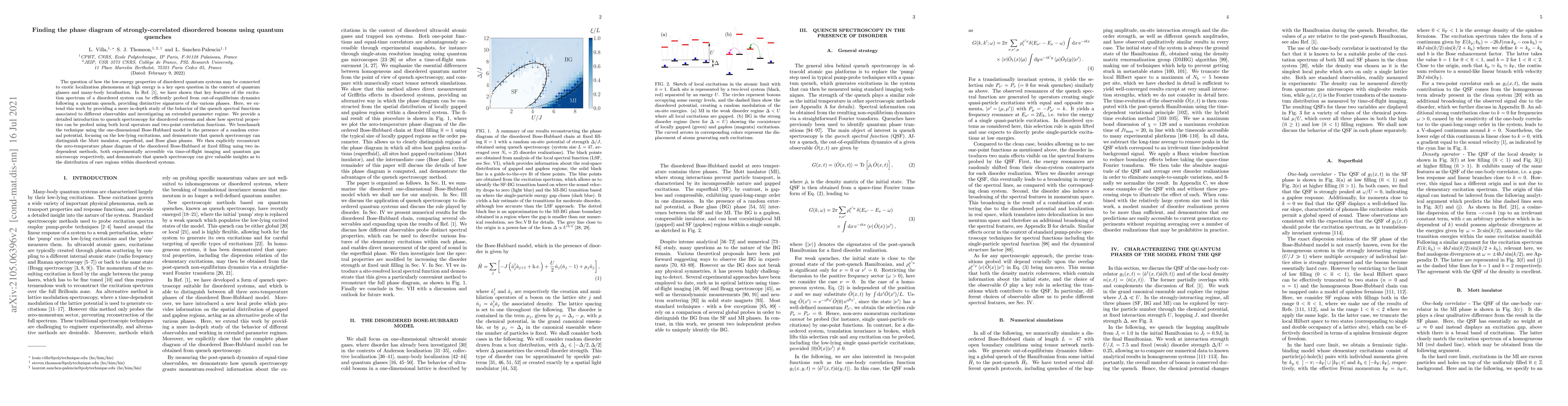 The question of how the low-energy properties of disordered quantum systems may be connected to exotic localization phenomena at high energy is a key open question in the context of quantum glasses and many-body localization. In arXiv:2105.05774 we have shown that key features of the excitation spectrum of a disordered system can be efficiently probed from out-of-equilibrium dynamics following a quantum quench, providing distinctive signatures of the various phases. Here, we extend this work by providing a more in-depth study of the behavior of the quench spectral functions associated to different observables and investigating an extended parameter regime. We provide a detailed introduction to quench spectroscopy for disordered systems and show how spectral properties can be probed using both local operators and two-point correlation functions. We benchmark the technique using the one-dimensional Bose-Hubbard model in the presence of a random external potential, focusing on the low-lying excitations, and demonstrate that quench spectroscopy can distinguish the Mott insulator, superfluid, and Bose glass phases. We then explicitly reconstruct the zero-temperature phase diagram of the disordered Bose-Hubbard at fixed filling using two independent methods, both experimentally accessible via time-of-flight imaging and quantum gas microscopy respectively, and demonstrate that quench spectroscopy can give valuable insights as to the distribution of rare regions within disordered systems.