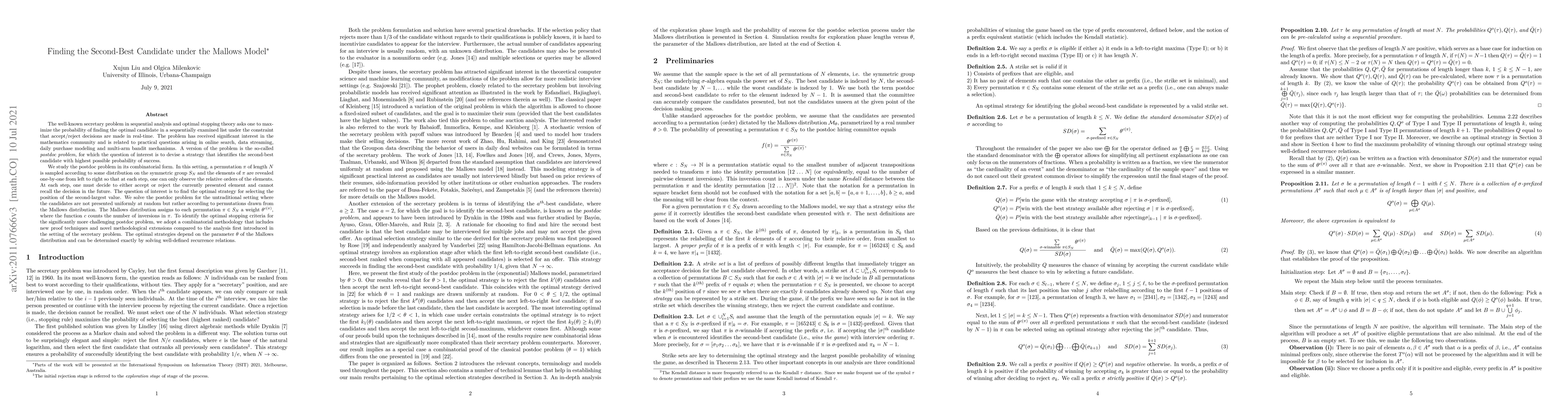 Researchers develop a strategy to find the second-best candidate in a list of N elements, with candidates presented according to permutations drawn from the Mallows distribution, achieving optimal probability of success.