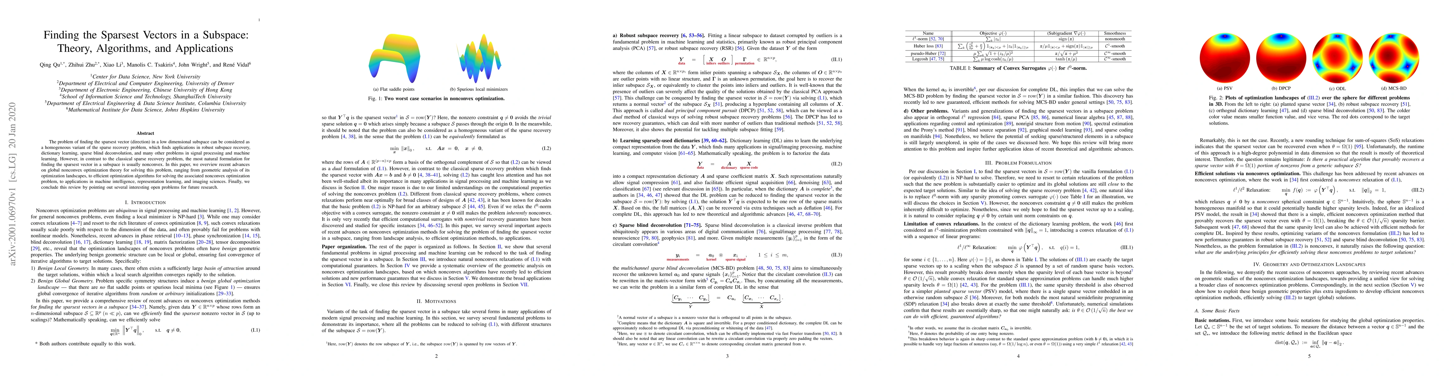 The problem of finding the sparsest vector (direction) in a low dimensional subspace can be considered as a homogeneous variant of the sparse recovery problem, which finds applications in robust subspace recovery, dictionary learning, sparse blind deconvolution, and many other problems in signal processing and machine learning. However, in contrast to the classical sparse recovery problem, the most natural formulation for finding the sparsest vector in a subspace is usually nonconvex. In this paper, we overview recent advances on global nonconvex optimization theory for solving this problem, ranging from geometric analysis of its optimization landscapes, to efficient optimization algorithms for solving the associated nonconvex optimization problem, to applications in machine intelligence, representation learning, and imaging sciences. Finally, we conclude this review by pointing out several interesting open problems for future research.