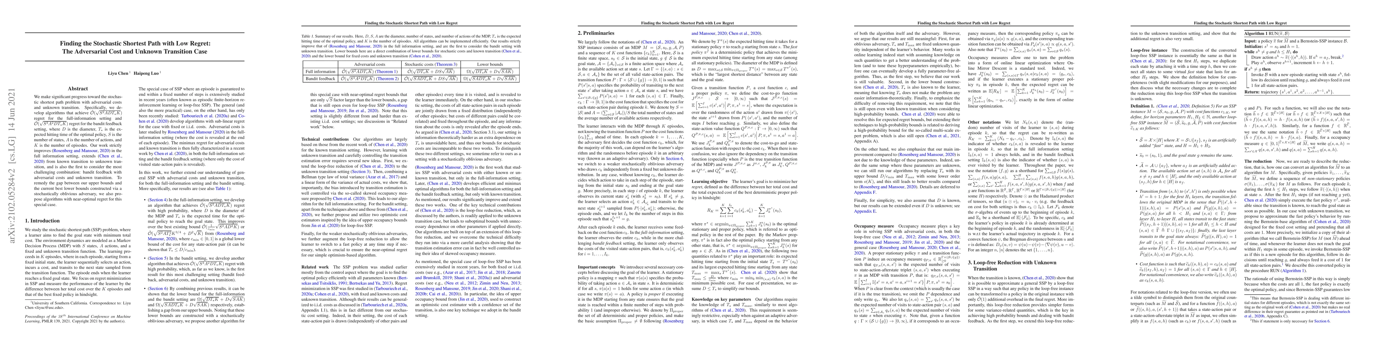 This paper develops algorithms for finding the stochastic shortest path under adversarial costs and unknown transition probabilities, achieving improved regret bounds for both full-information and bandit feedback settings. The proposed methods extend previous results and address the challenging combination of bandit feedback with unknown transitions and adversarial costs.