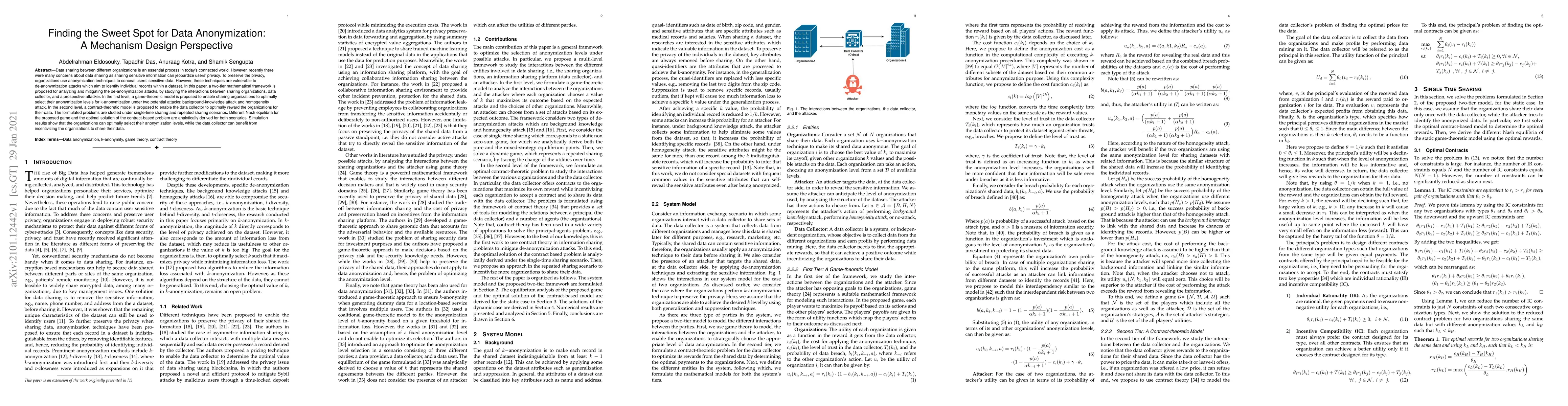 Data sharing between different organizations is an essential process in today's connected world. However, recently there were many concerns about data sharing as sharing sensitive information can jeopardize users' privacy. To preserve the privacy, organizations use anonymization techniques to conceal users' sensitive data. However, these techniques are vulnerable to de-anonymization attacks which aim to identify individual records within a dataset. In this paper, a two-tier mathematical framework is proposed for analyzing and mitigating the de-anonymization attacks, by studying the interactions between sharing organizations, data collector, and a prospective attacker. In the first level, a game-theoretic model is proposed to enable sharing organizations to optimally select their anonymization levels for k-anonymization under two potential attacks: background-knowledge attack and homogeneity attack. In the second level, a contract-theoretic model is proposed to enable the data collector to optimally reward the organizations for their data. The formulated problems are studied under single-time sharing and repeated sharing scenarios. Different Nash equilibria for the proposed game and the optimal solution of the contract-based problem are analytically derived for both scenarios. Simulation results show that the organizations can optimally select their anonymization levels, while the data collector can benefit from incentivizing the organizations to share their data.