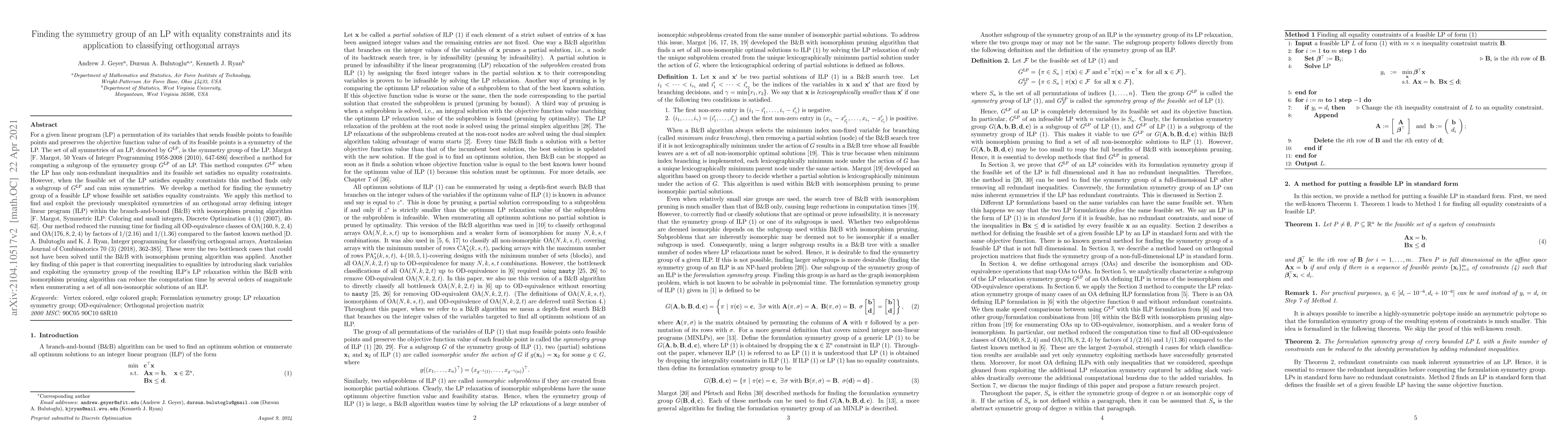 This paper develops a method to find the symmetry group of linear programs (LPs) with equality constraints, extending Margot's prior work which only handled non-redundant inequalities without equality constraints. The new method is applied to classify orthogonal arrays, significantly reducing the running time for solving two bottleneck cases.