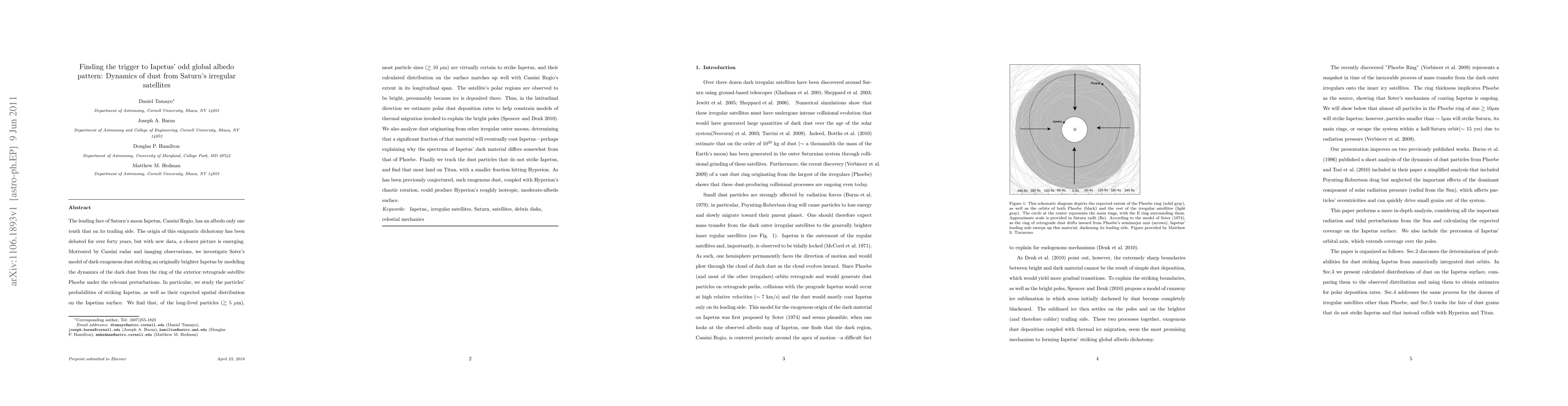 This research investigates the dynamics of dust from Saturn's irregular satellites, particularly Phoebe, to explain the contrasting albedo on Iapetus. The study finds that dark dust from Phoebe likely accounts for the dark Cassini Regio on Iapetus' leading face, while the bright polar regions are due to ice deposition.