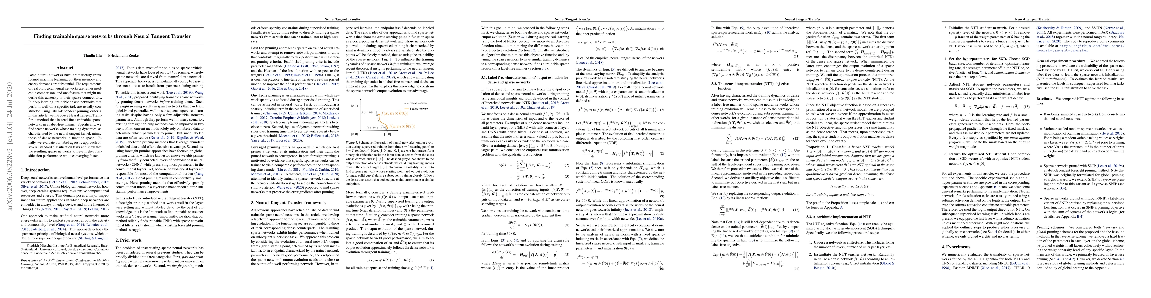 Deep neural networks have dramatically transformed machine learning, but their memory and energy demands are substantial. The requirements of real biological neural networks are rather modest in comparison, and one feature that might underlie this austerity is their sparse connectivity. In deep learning, trainable sparse networks that perform well on a specific task are usually constructed using label-dependent pruning criteria. In this article, we introduce Neural Tangent Transfer, a method that instead finds trainable sparse networks in a label-free manner. Specifically, we find sparse networks whose training dynamics, as characterized by the neural tangent kernel, mimic those of dense networks in function space. Finally, we evaluate our label-agnostic approach on several standard classification tasks and show that the resulting sparse networks achieve higher classification performance while converging faster.