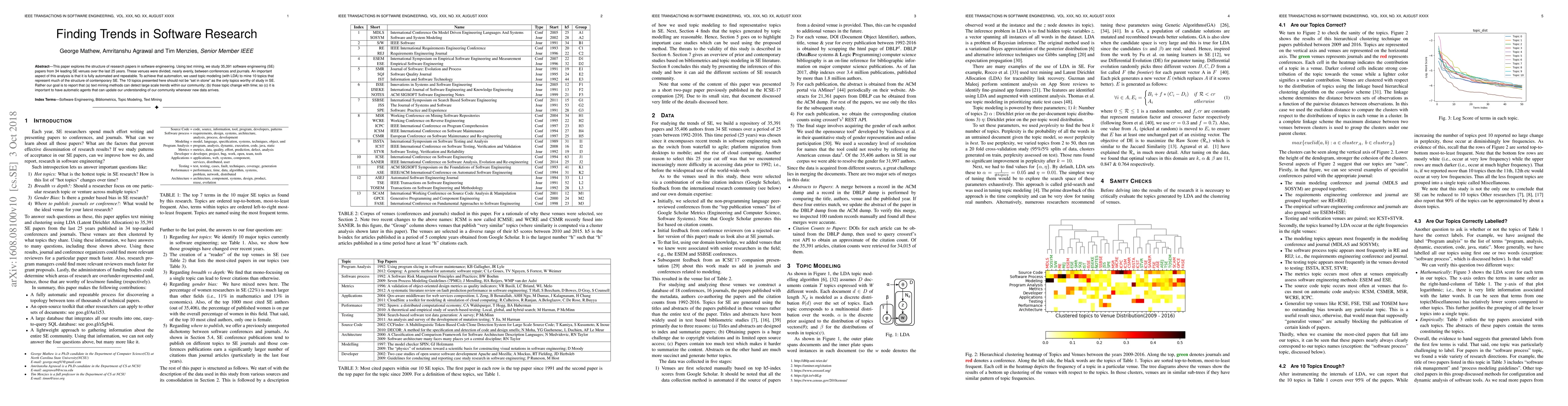 This paper explores the structure of research papers in software engineering. Using text mining, we study 35,391 software engineering (SE) papers from 34 leading SE venues over the last 25 years. These venues were divided, nearly evenly, between conferences and journals. An important aspect of this analysis is that it is fully automated and repeatable. To achieve that automation, we used a stable topic modeling technique called LDADE that fully automates parameter tuning in LDA. Using LDADE, we mine 11 topics that represent much of the structure of contemporary SE. The 11 topics presented here should not be "set in stone" as the only topics worthy of study in SE. Rather our goal is to report that (a) text mining methods can detect large scale trends within our community; (b) those topic change with time; so (c) it is important to have automatic agents that can update our understanding of our community whenever new data arrives.