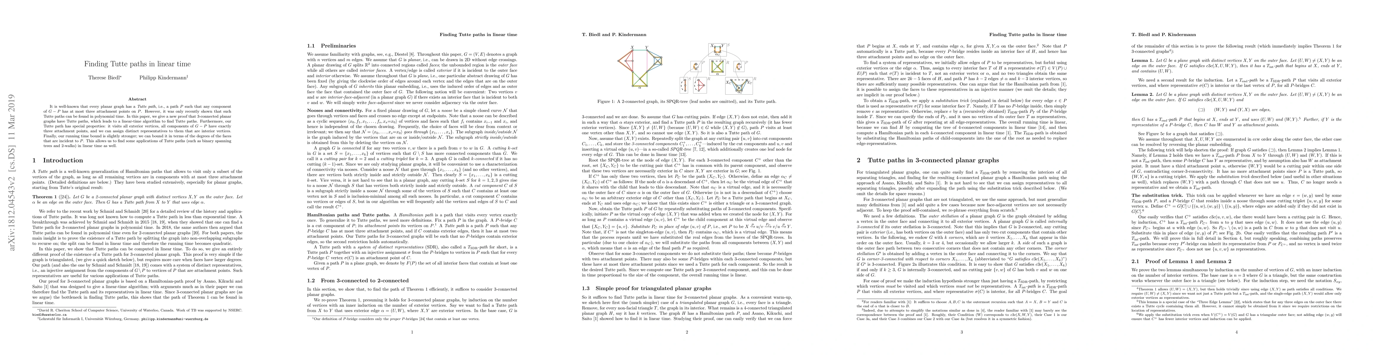 It is well-known that every planar graph has a Tutte path, i.e., a path $P$ such that any component of $G-P$ has at most three attachment points on $P$. However, it was only recently shown that such Tutte paths can be found in polynomial time. In this paper, we give a new proof that 3-connected planar graphs have Tutte paths, which leads to a linear-time algorithm to find Tutte paths. Furthermore, our Tutte path has special properties: it visits all exterior vertices, all components of $G-P$ have exactly three attachment points, and we can assign distinct representatives to them that are interior vertices. Finally, our running time bound is slightly stronger; we can bound it in terms of the degrees of the faces that are incident to $P$. This allows us to find some applications of Tutte paths (such as binary spanning trees and 2-walks) in linear time as well.