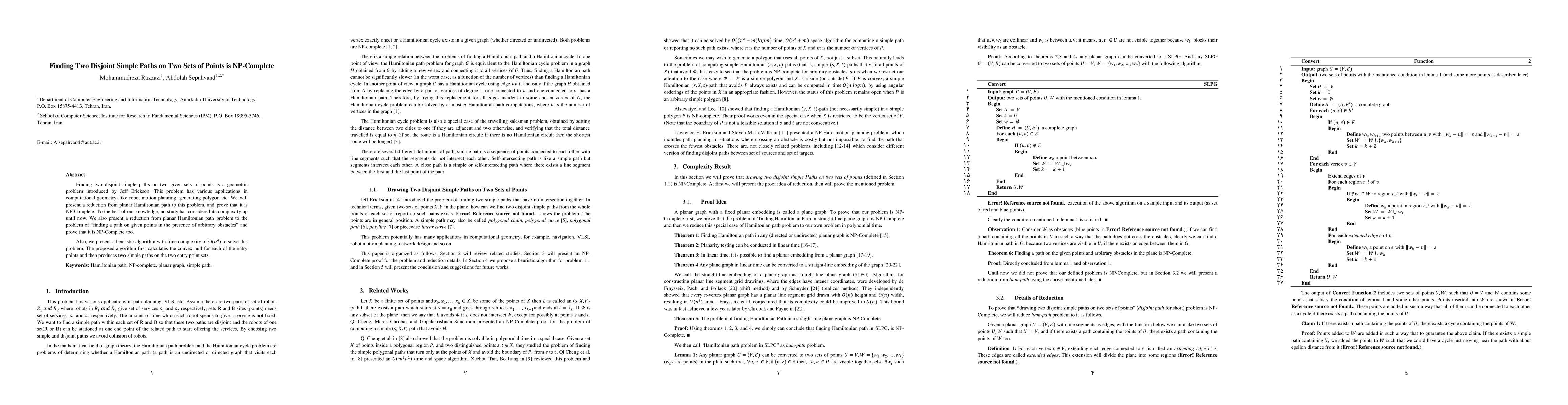 This paper proves that finding two disjoint simple paths on two sets of points is NP-Complete by reducing the planar Hamiltonian path problem to it. Additionally, it demonstrates the NP-Completeness of finding a path on given points amidst obstacles and proposes a heuristic algorithm with O(n^4) time complexity.