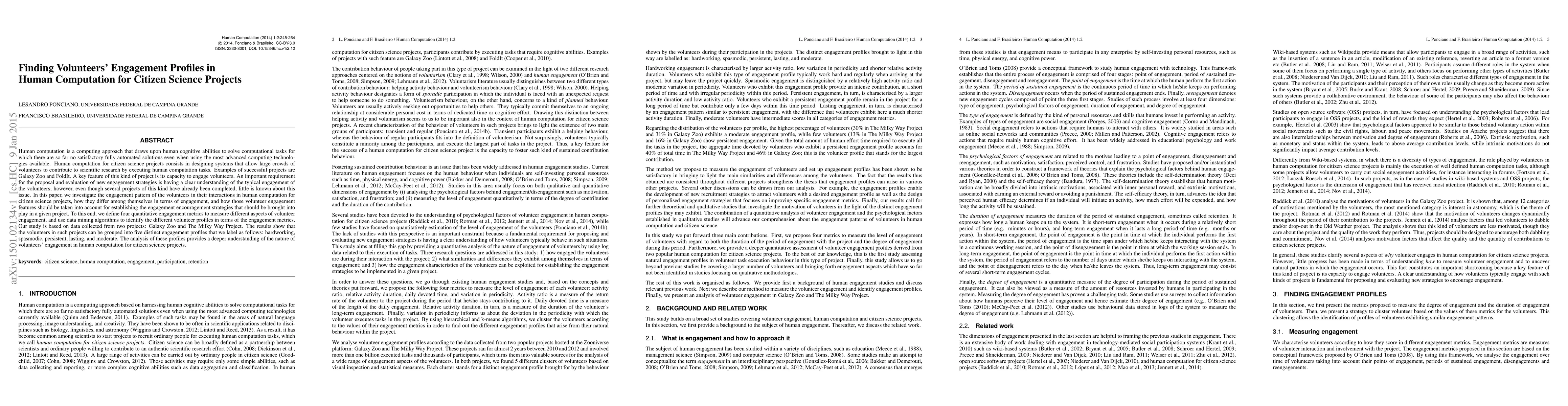 This paper investigates volunteer engagement patterns in human computation for citizen science projects, identifying five distinct engagement profiles: hardworking, spasmodic, persistent, lasting, and moderate. It uses quantitative metrics and data mining to analyze engagement from projects like Galaxy Zoo and The Milky Way Project, aiming to inform engagement strategy development.