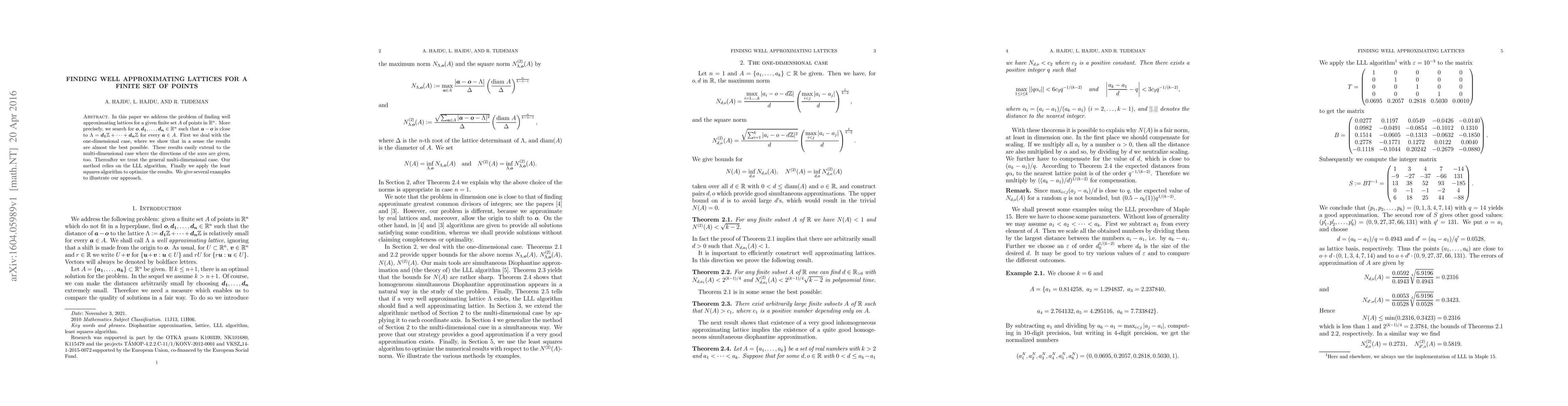 In this paper we address the problem of finding well approximating lattices for a given finite set $A$ of points in ${\mathbb R}^n$. More precisely, we search for $\v{o},\v{d_1}, \dots,\v{d_n}\in \mathbb{R}^n$ such that $\v{a}-\v{o}$ is close to $\Lambda=\v{d_1}\mathbb{Z}+\dots+\v{d_n}\mathbb{Z}$ for every $\v{a}\in A$. First we deal with the one-dimensional case, where we show that in a sense the results are almost the best possible. These results easily extend to the multi-dimensional case where the directions of the axes are given, too. Thereafter we treat the general multi-dimensional case. Our method relies on the LLL algorithm. Finally we apply the least squares algorithm to optimize the results. We give several examples to illustrate our approach.