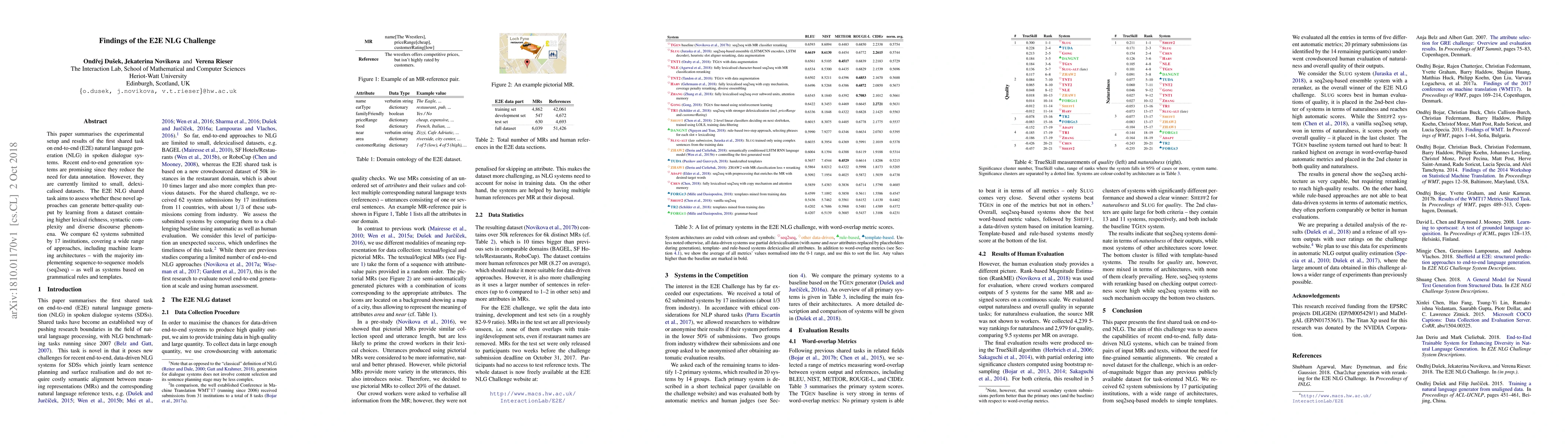 This paper summarises the experimental setup and results of the first shared task on end-to-end (E2E) natural language generation (NLG) in spoken dialogue systems. Recent end-to-end generation systems are promising since they reduce the need for data annotation. However, they are currently limited to small, delexicalised datasets. The E2E NLG shared task aims to assess whether these novel approaches can generate better-quality output by learning from a dataset containing higher lexical richness, syntactic complexity and diverse discourse phenomena. We compare 62 systems submitted by 17 institutions, covering a wide range of approaches, including machine learning architectures -- with the majority implementing sequence-to-sequence models (seq2seq) -- as well as systems based on grammatical rules and templates.