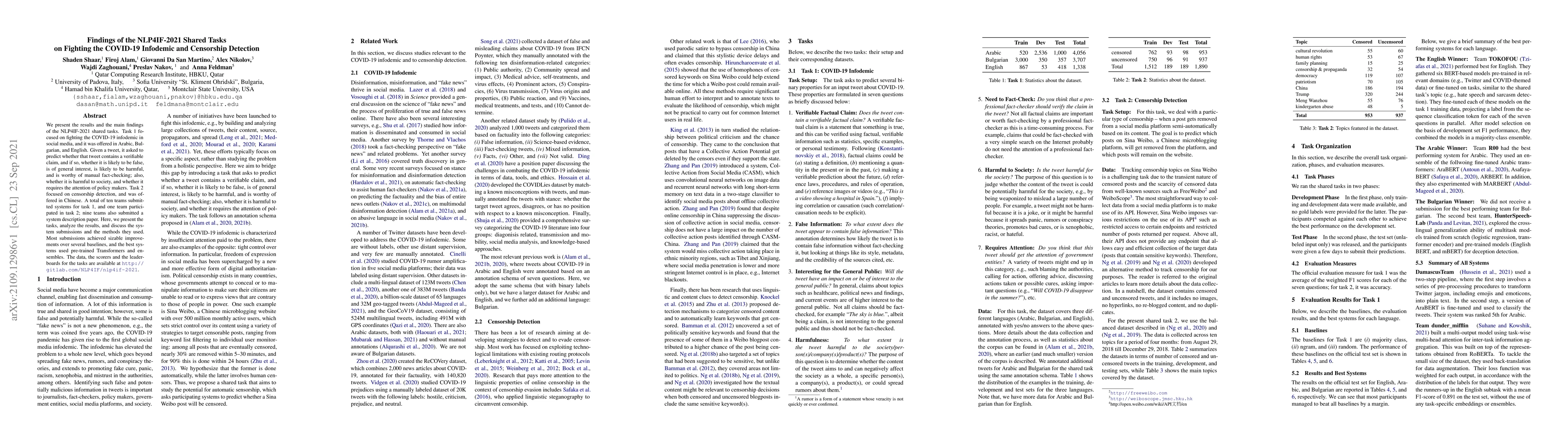 We present the results and the main findings of the NLP4IF-2021 shared tasks. Task 1 focused on fighting the COVID-19 infodemic in social media, and it was offered in Arabic, Bulgarian, and English. Given a tweet, it asked to predict whether that tweet contains a verifiable claim, and if so, whether it is likely to be false, is of general interest, is likely to be harmful, and is worthy of manual fact-checking; also, whether it is harmful to society, and whether it requires the attention of policy makers. Task~2 focused on censorship detection, and was offered in Chinese. A total of ten teams submitted systems for task 1, and one team participated in task 2; nine teams also submitted a system description paper. Here, we present the tasks, analyze the results, and discuss the system submissions and the methods they used. Most submissions achieved sizable improvements over several baselines, and the best systems used pre-trained Transformers and ensembles. The data, the scorers and the leaderboards for the tasks are available at http://gitlab.com/NLP4IF/nlp4if-2021.