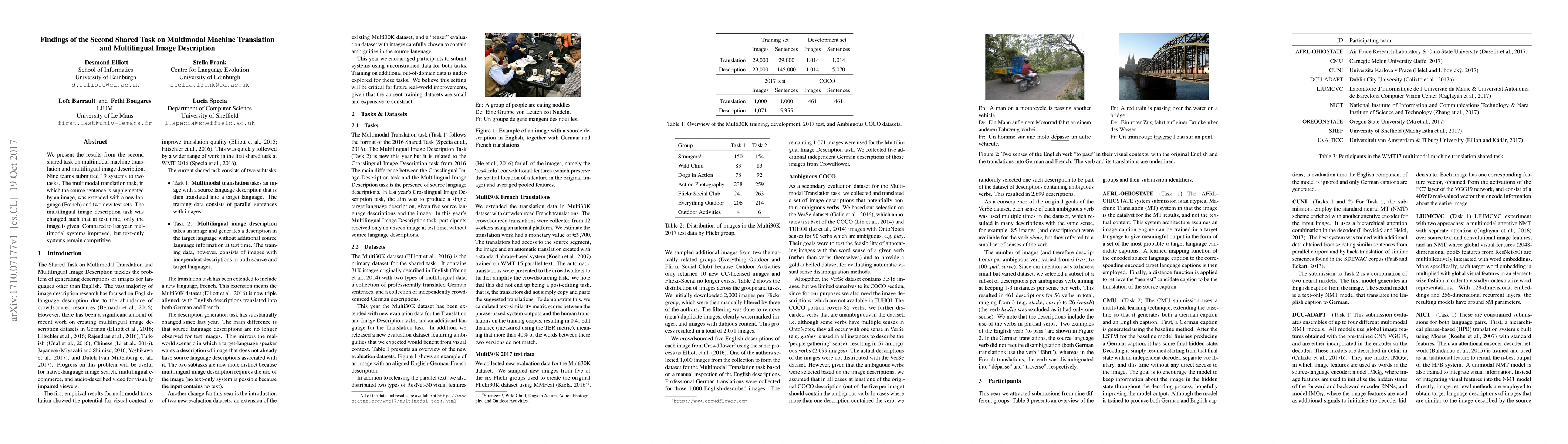 The second shared task on multimodal machine translation and multilingual image description saw nine teams submit 19 systems, with notable improvements in multimodal systems but continued competitiveness of text-only systems. The tasks included new language and test sets, notably French in the translation task and image-only input in the description task.
