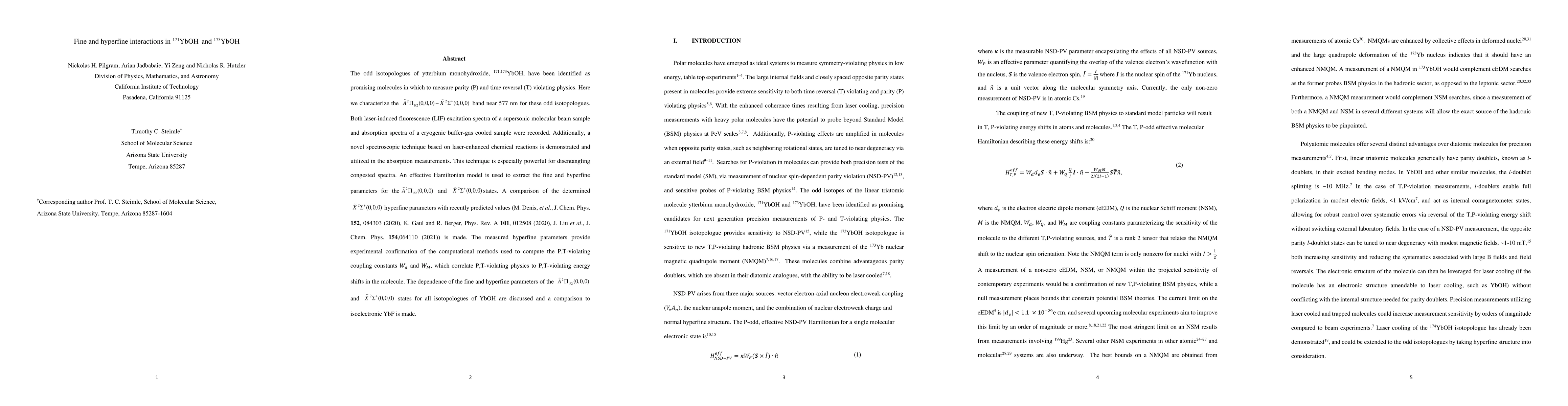 The research methodology involved characterizing the \~A^2\Pi_{1/2}(0,0,0)-\~X^2\Sigma^+(0,0,0) band near 577 nm for odd isotopologues of ytterbium monohydroxide, $^{171,173}$YbOH, using laser-induced fluorescence (LIF) excitation spectra of a supersonic molecular beam sample and absorption spectra of a cryogenic buffer-gas cooled sample. A novel spectroscopic technique based on laser-enhanced chemical reactions was also demonstrated and utilized in the absorption measurements.