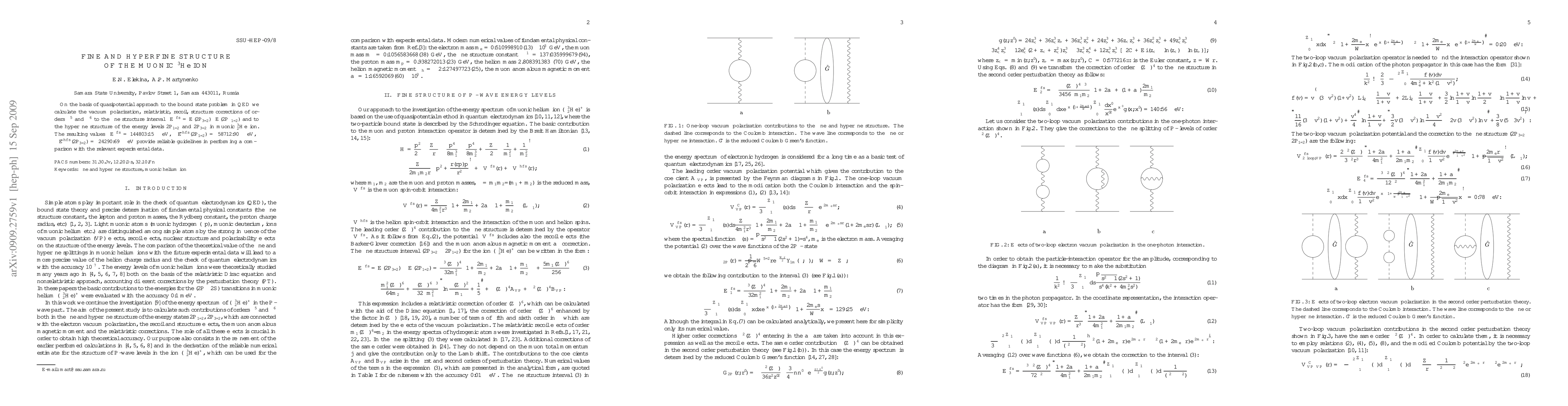 This paper calculates corrections to the fine and hyperfine structures in muonic ^3He ion using the quasipotential approach in QED, yielding precise values for comparison with experimental data. The results include $\Delta E^{fs}= 144803.15 \mu eV$ for the fine structure and $\Delta \tilde E^{hfs}(2P_{1/2})=-58712.90 \mu eV$ and $\Delta \tilde E^{hfs}(2P_{3/2})=-24290.69 \mu eV$ for the hyperfine structure.