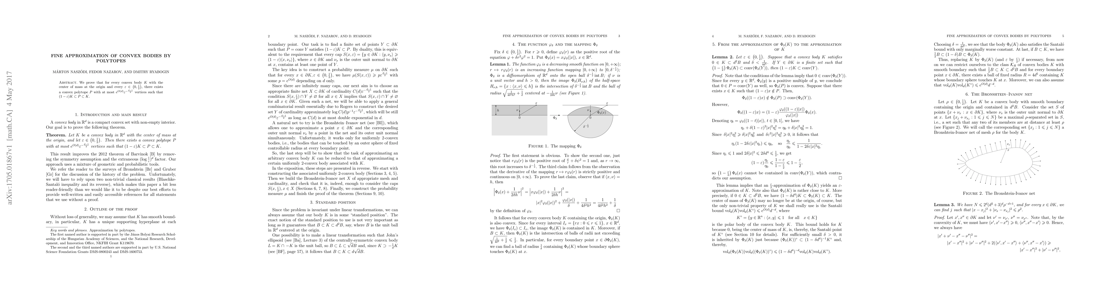 We prove that for every convex body $K$ with the center of mass at the origin and every $\varepsilon\in \left(0,\frac{1}{2}\right)$, there exists a convex polytope $P$ with at most $e^{O(d)}\varepsilon^{-\frac{d-1}{2}}$ vertices such that $(1-\varepsilon)K\subset P\subset K$.