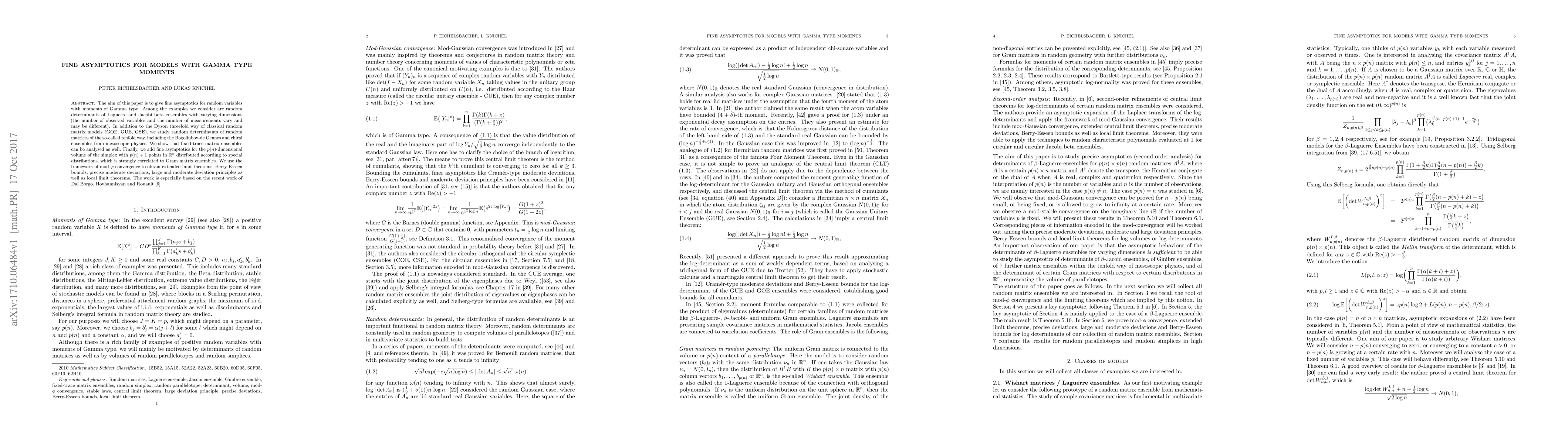 This paper provides fine asymptotic results for random variables with Gamma type moments, focusing on random determinants from various ensembles, including Laguerre, Jacobi, Bogoliubov-de Gennes, and chiral ensembles. It employs mod-$\varphi$ convergence to derive extended limit theorems and precise deviation principles.