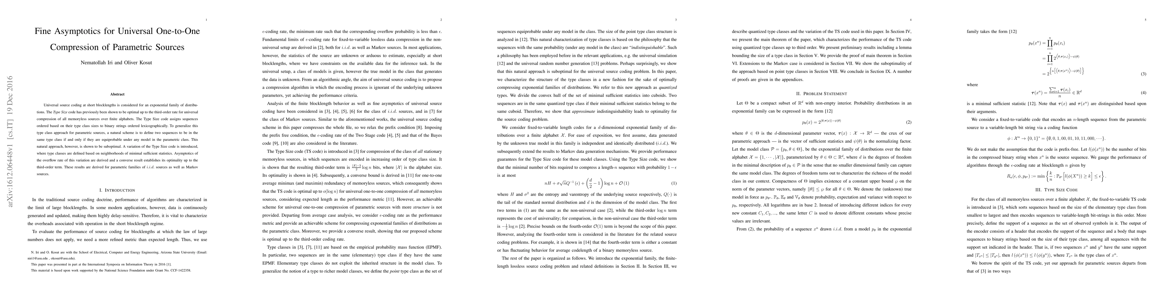 This paper introduces a refined version of the Type Size code to achieve optimal universal one-to-one compression for parametric sources, deriving fine asymptotics for the overflow rate and proving its optimality up to the third-order term for both $i.i.d.$ and Markov sources.