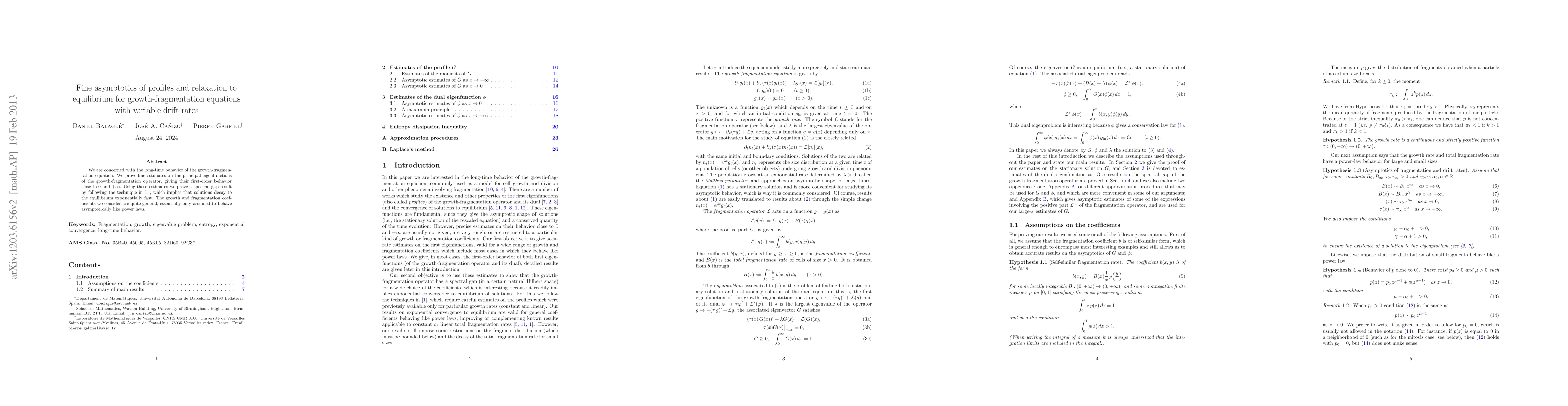 This paper investigates the long-term behavior of growth-fragmentation equations with variable drift rates, proving fine asymptotic estimates on principal eigenfunctions and demonstrating exponential convergence to equilibrium using a spectral gap result. The study considers general growth and fragmentation coefficients that follow power law asymptotics.