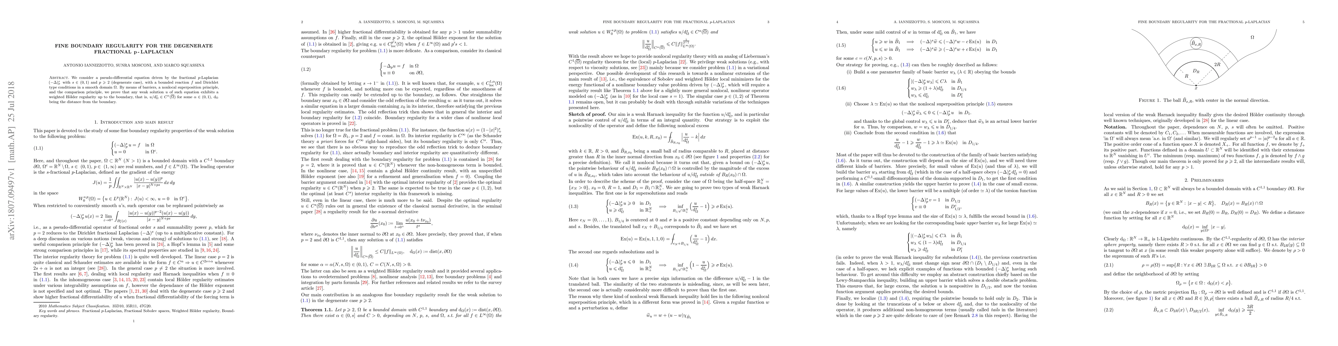 This paper proves fine boundary regularity for weak solutions to a degenerate fractional $p$-Laplacian equation using barriers, a nonlocal superposition principle, and the comparison principle, demonstrating that solutions exhibit weighted H\"older regularity up to the boundary.