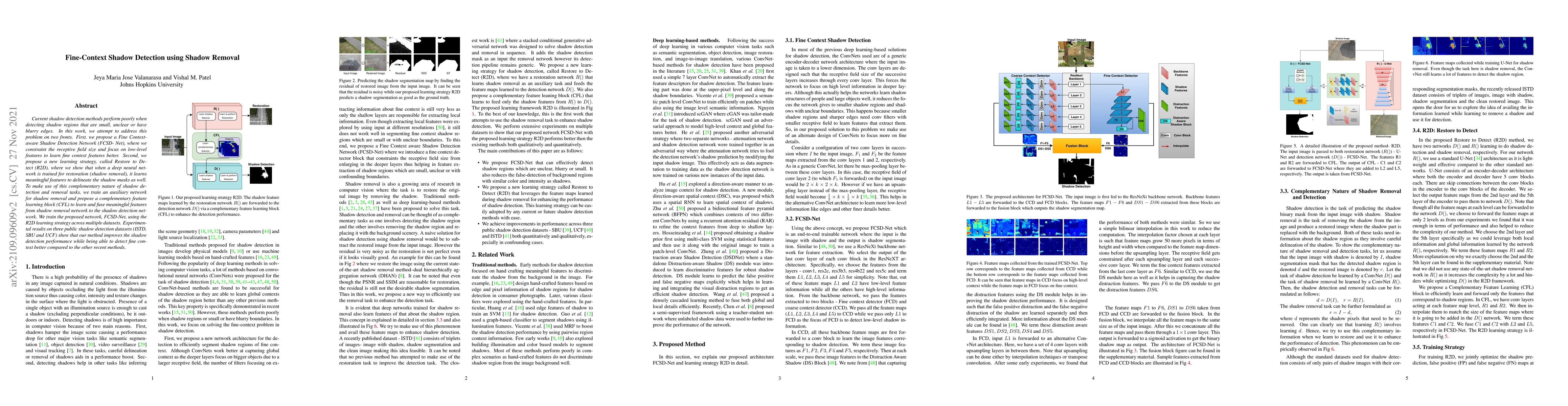 This paper proposes a Fine Context-aware Shadow Detection Network (FCSD-Net) that enhances shadow detection by focusing on low-level features and introduces a Restore to Detect (R2D) learning strategy that leverages shadow removal for better feature learning. Experimental results show improved performance on multiple shadow detection datasets.