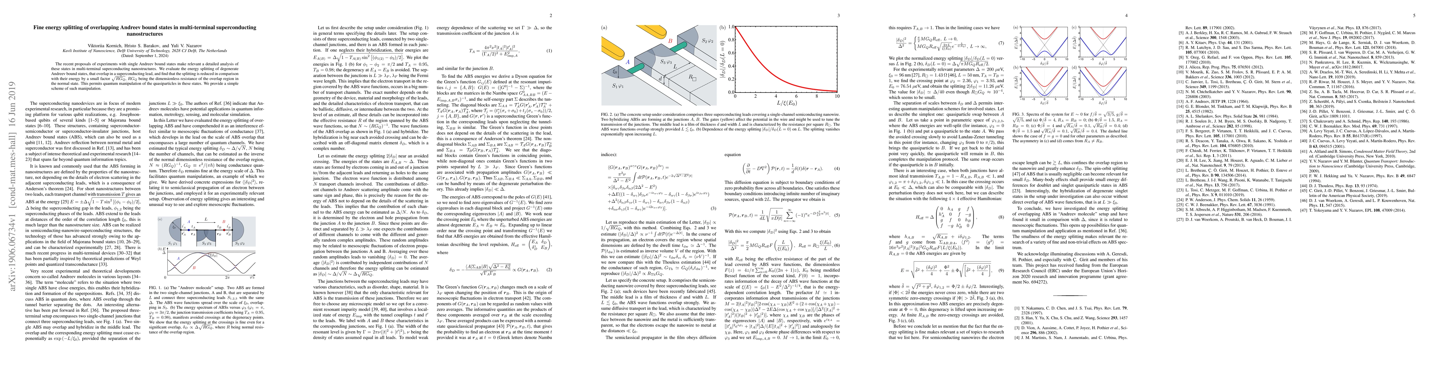 This paper investigates the fine energy splitting of overlapping Andreev bound states in multi-terminal superconducting nanostructures, revealing that the splitting is reduced by a factor $\sqrt{R G_Q}$, allowing for quantum manipulation of quasiparticles. A simple scheme for such manipulation is proposed.