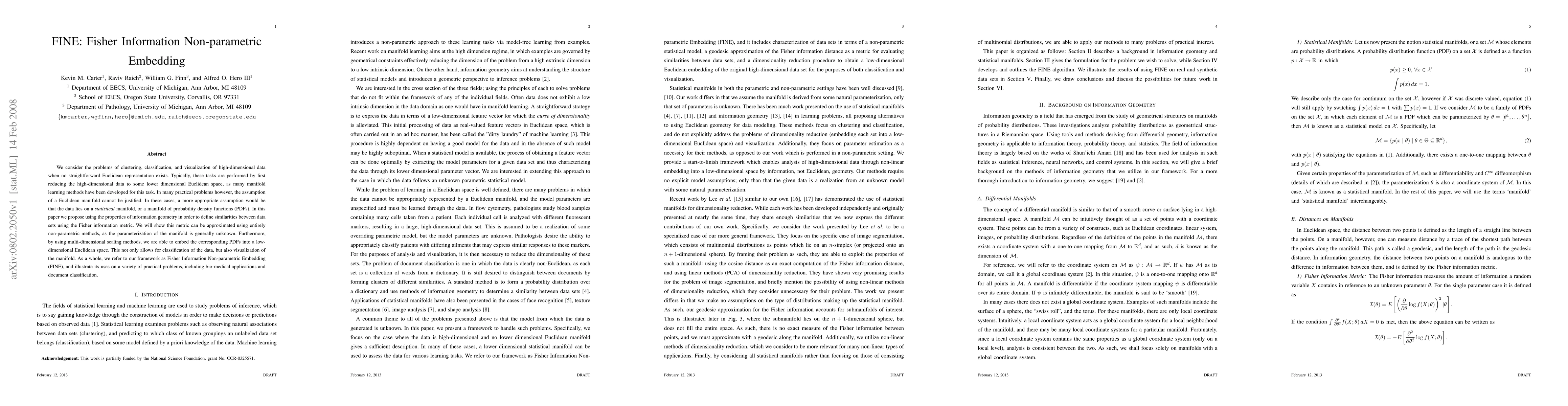 We consider the problems of clustering, classification, and visualization of high-dimensional data when no straightforward Euclidean representation exists. Typically, these tasks are performed by first reducing the high-dimensional data to some lower dimensional Euclidean space, as many manifold learning methods have been developed for this task. In many practical problems however, the assumption of a Euclidean manifold cannot be justified. In these cases, a more appropriate assumption would be that the data lies on a statistical manifold, or a manifold of probability density functions (PDFs). In this paper we propose using the properties of information geometry in order to define similarities between data sets using the Fisher information metric. We will show this metric can be approximated using entirely non-parametric methods, as the parameterization of the manifold is generally unknown. Furthermore, by using multi-dimensional scaling methods, we are able to embed the corresponding PDFs into a low-dimensional Euclidean space. This not only allows for classification of the data, but also visualization of the manifold. As a whole, we refer to our framework as Fisher Information Non-parametric Embedding (FINE), and illustrate its uses on a variety of practical problems, including bio-medical applications and document classification.