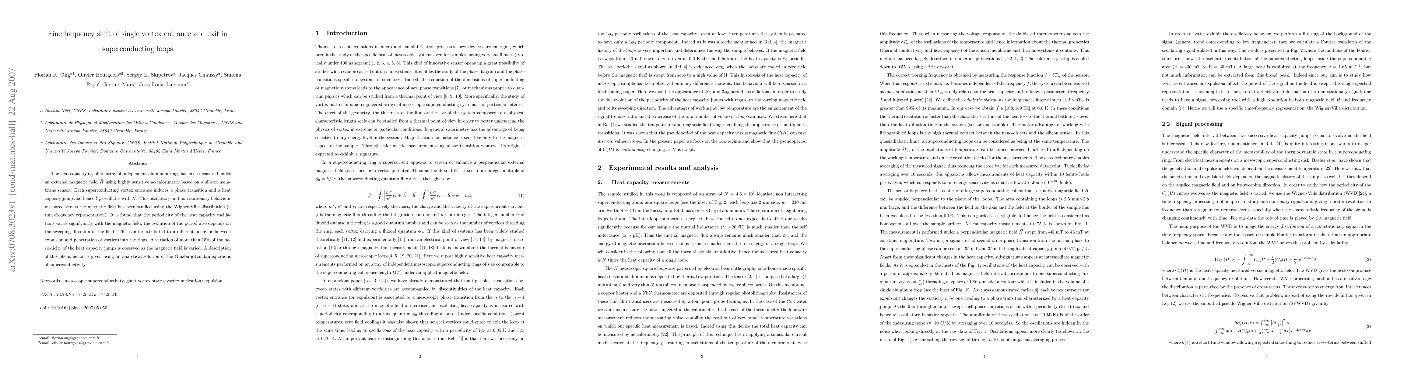 This study investigates the heat capacity oscillations of aluminum rings under varying magnetic fields, revealing significant frequency shifts during vortex entrance and exit. The oscillations' periodicity varies with the magnetic field, showing a more than 15% change, and are analyzed using the Wigner-Ville distribution and described by the Ginzburg-Landau equations.