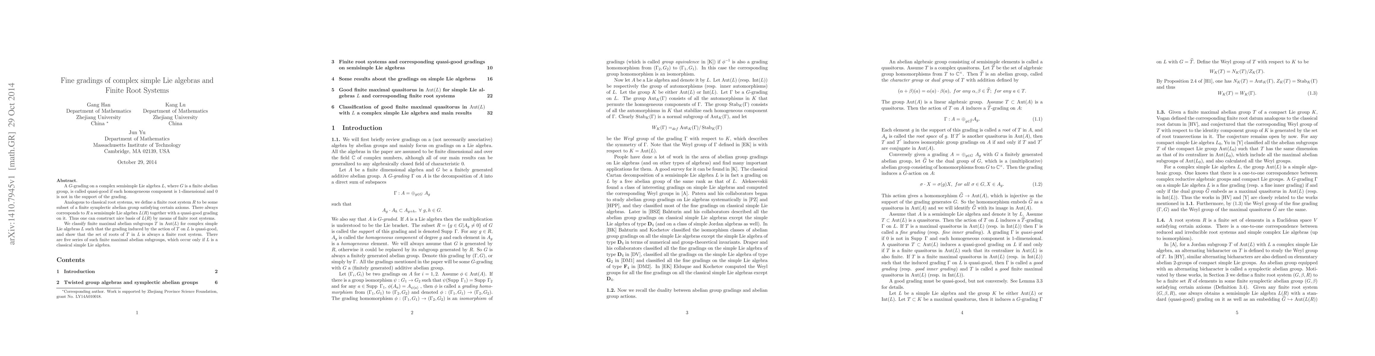 A $G$-grading on a complex semisimple Lie algebra $L$, where $G$ is a finite abelian group, is called quasi-good if each homogeneous component is 1-dimensional and 0 is not in the support of the grading. Analogous to classical root systems, we define a finite root system $R$ to be some subset of a finite symplectic abelian group satisfying certain axioms. There always corresponds to $R$ a semisimple Lie algebra $L(R)$ together with a quasi-good grading on it. Thus one can construct nice basis of $L(R)$ by means of finite root systems. We classify finite maximal abelian subgroups $T$ in $\Aut(L)$ for complex simple Lie algebras $L$ such that the grading induced by the action of $T$ on $L$ is quasi-good, and show that the set of roots of $T$ in $L$ is always a finite root system. There are five series of such finite maximal abelian subgroups, which occur only if $L$ is a classical simple Lie algebra.