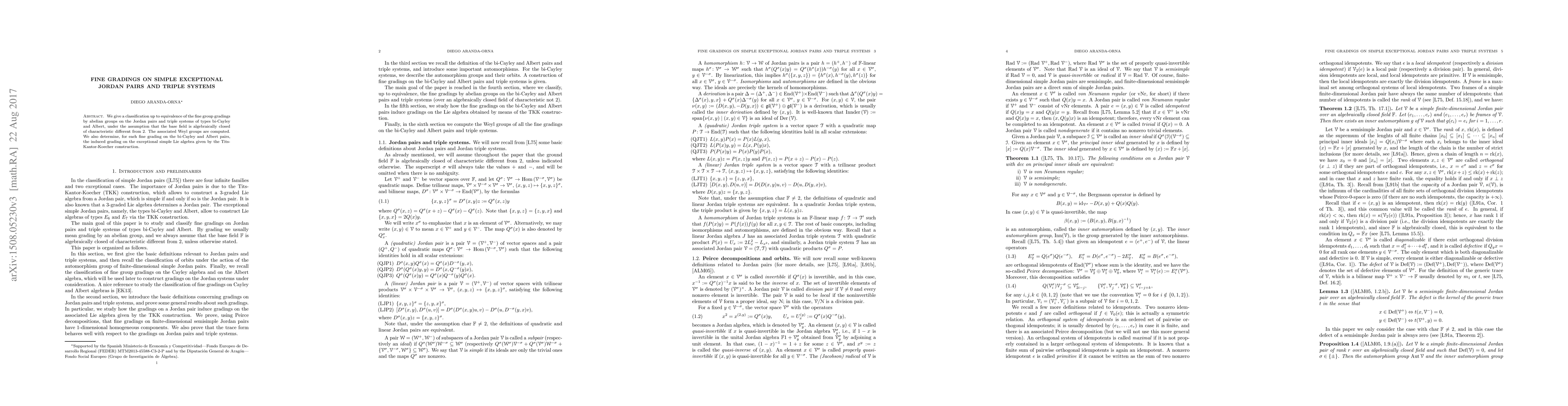 This paper classifies fine group gradings on exceptional Jordan pairs and triple systems of types bi-Cayley and Albert by abelian groups, computes their associated Weyl groups, and determines induced gradings on exceptional simple Lie algebras derived from the Tits-Kantor-Koecher construction. The base field is assumed to be algebraically closed and of characteristic not equal to 2.