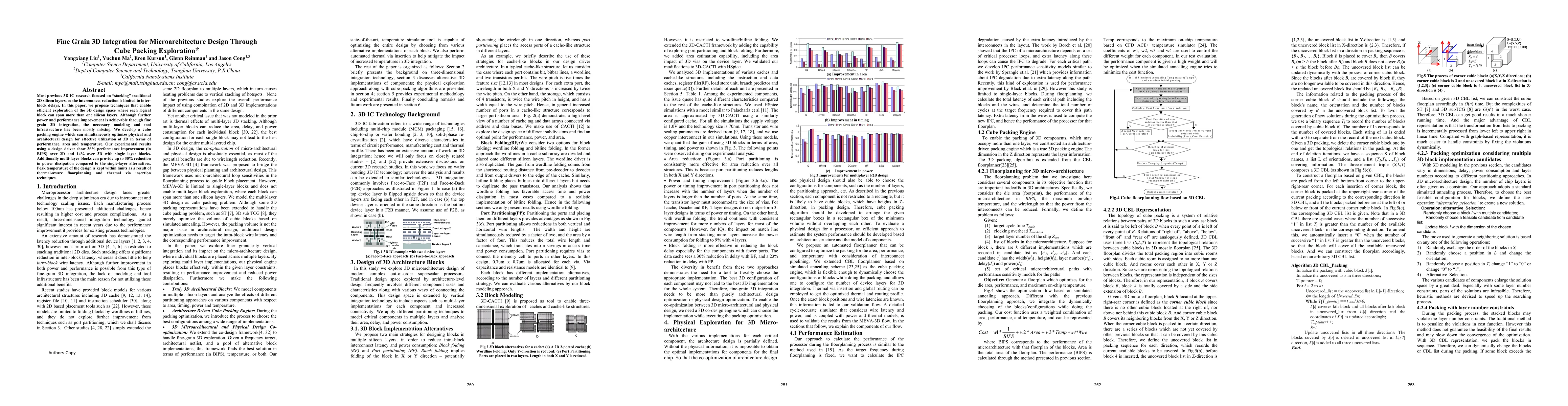 Most previous 3D IC research focused on stacking traditional 2D silicon layers, so the interconnect reduction is limited to inter-block delays. In this paper, we propose techniques that enable efficient exploration of the 3D design space where each logical block can span more than one silicon layers. Although further power and performance improvement is achievable through fine grain 3D integration, the necessary modeling and tool infrastructure has been mostly missing. We develop a cube packing engine which can simultaneously optimize physical and architectural design for effective utilization of 3D in terms of performance, area and temperature. Our experimental results using a design driver show 36% performance improvement (in BIPS) over 2D and 14% over 3D with single layer blocks. Additionally multi-layer blocks can provide up to 30% reduction in power dissipation compared to the single-layer alternatives. Peak temperature of the design is kept within limits as a result of thermal-aware floorplanning and thermal via insertion techniques.