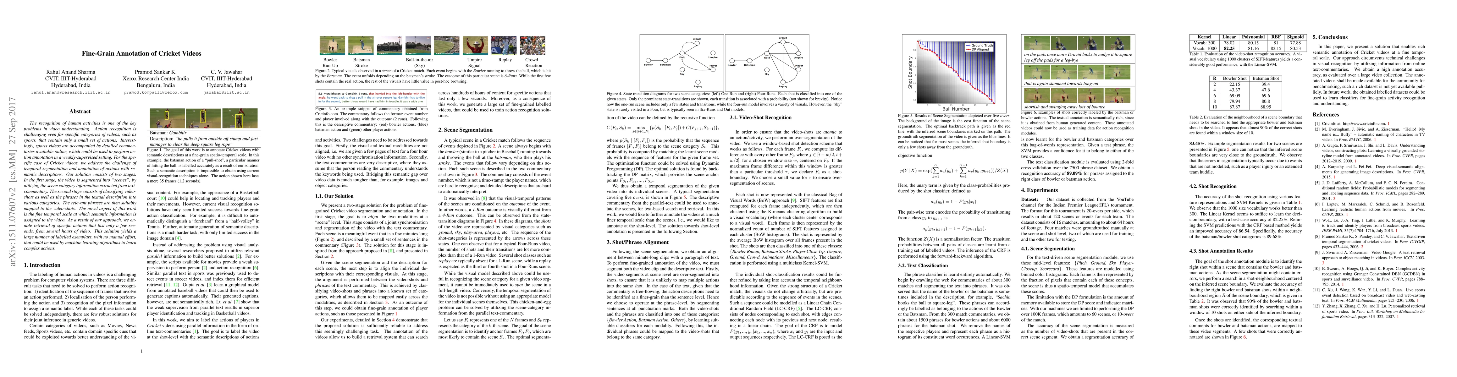 The recognition of human activities is one of the key problems in video understanding. Action recognition is challenging even for specific categories of videos, such as sports, that contain only a small set of actions. Interestingly, sports videos are accompanied by detailed commentaries available online, which could be used to perform action annotation in a weakly-supervised setting. For the specific case of Cricket videos, we address the challenge of temporal segmentation and annotation of ctions with semantic descriptions. Our solution consists of two stages. In the first stage, the video is segmented into "scenes", by utilizing the scene category information extracted from text-commentary. The second stage consists of classifying video-shots as well as the phrases in the textual description into various categories. The relevant phrases are then suitably mapped to the video-shots. The novel aspect of this work is the fine temporal scale at which semantic information is assigned to the video. As a result of our approach, we enable retrieval of specific actions that last only a few seconds, from several hours of video. This solution yields a large number of labeled exemplars, with no manual effort, that could be used by machine learning algorithms to learn complex actions.