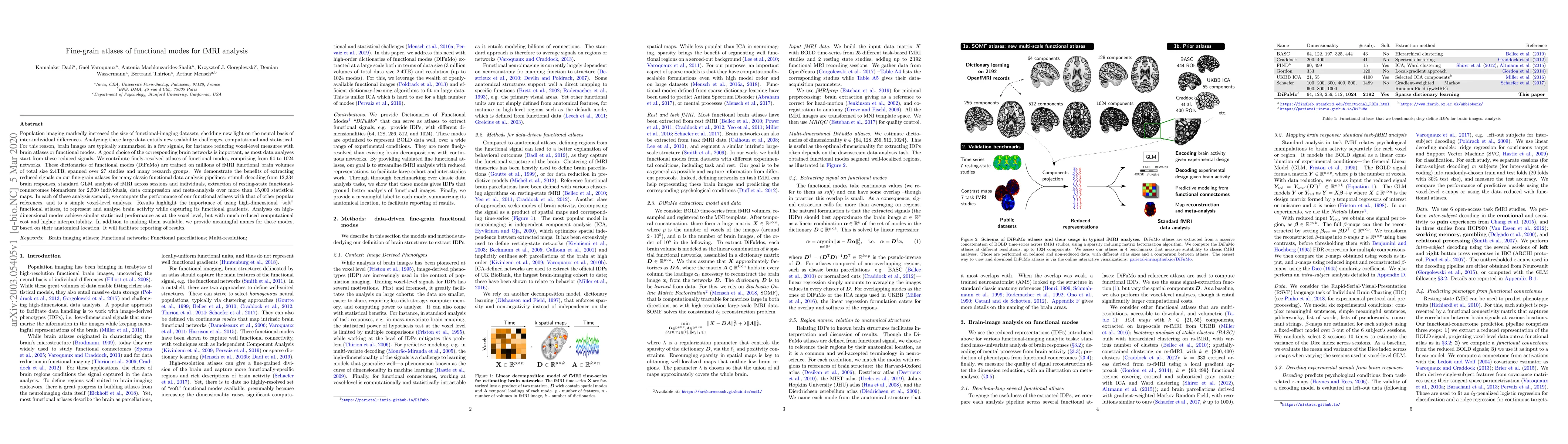 Population imaging markedly increased the size of functional-imaging datasets, shedding new light on the neural basis of inter-individual differences. Analyzing these large data entails new scalability challenges, computational and statistical. For this reason, brain images are typically summarized in a few signals, for instance reducing voxel-level measures with brain atlases or functional modes. A good choice of the corresponding brain networks is important, as most data analyses start from these reduced signals. We contribute finely-resolved atlases of functional modes, comprising from 64 to 1024 networks. These dictionaries of functional modes (DiFuMo) are trained on millions of fMRI functional brain volumes of total size 2.4TB, spanned over 27 studies and many research groups. We demonstrate the benefits of extracting reduced signals on our fine-grain atlases for many classic functional data analysis pipelines: stimuli decoding from 12,334 brain responses, standard GLM analysis of fMRI across sessions and individuals, extraction of resting-state functional-connectomes biomarkers for 2,500 individuals, data compression and meta-analysis over more than 15,000 statistical maps. In each of these analysis scenarii, we compare the performance of our functional atlases with that of other popular references, and to a simple voxel-level analysis. Results highlight the importance of using high-dimensional "soft" functional atlases, to represent and analyse brain activity while capturing its functional gradients. Analyses on high-dimensional modes achieve similar statistical performance as at the voxel level, but with much reduced computational cost and higher interpretability. In addition to making them available, we provide meaningful names for these modes, based on their anatomical location. It will facilitate reporting of results.
