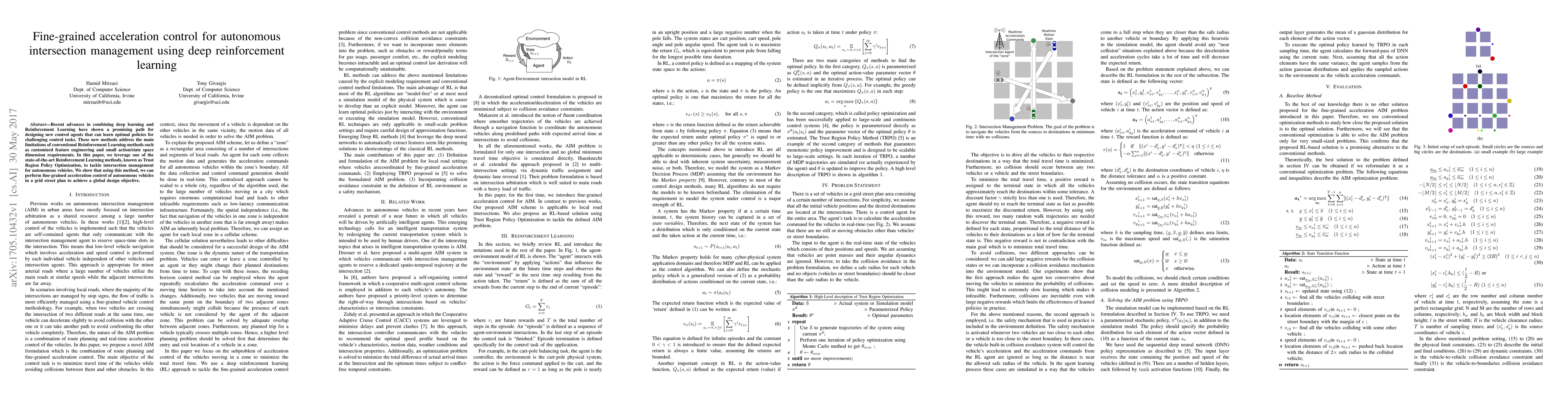 This paper employs Trust Region Policy Optimization, a state-of-the-art Reinforcement Learning method, to develop a fine-grained acceleration control system for autonomous vehicles navigating intersections. The approach aims to achieve optimal intersection management without the need for customized feature engineering.