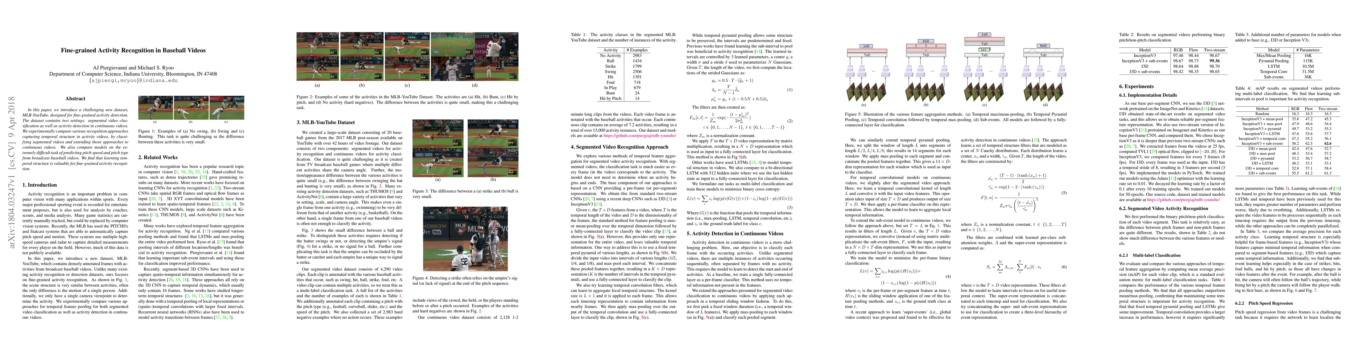 In this paper, we introduce a challenging new dataset, MLB-YouTube, designed for fine-grained activity detection. The dataset contains two settings: segmented video classification as well as activity detection in continuous videos. We experimentally compare various recognition approaches capturing temporal structure in activity videos, by classifying segmented videos and extending those approaches to continuous videos. We also compare models on the extremely difficult task of predicting pitch speed and pitch type from broadcast baseball videos. We find that learning temporal structure is valuable for fine-grained activity recognition.