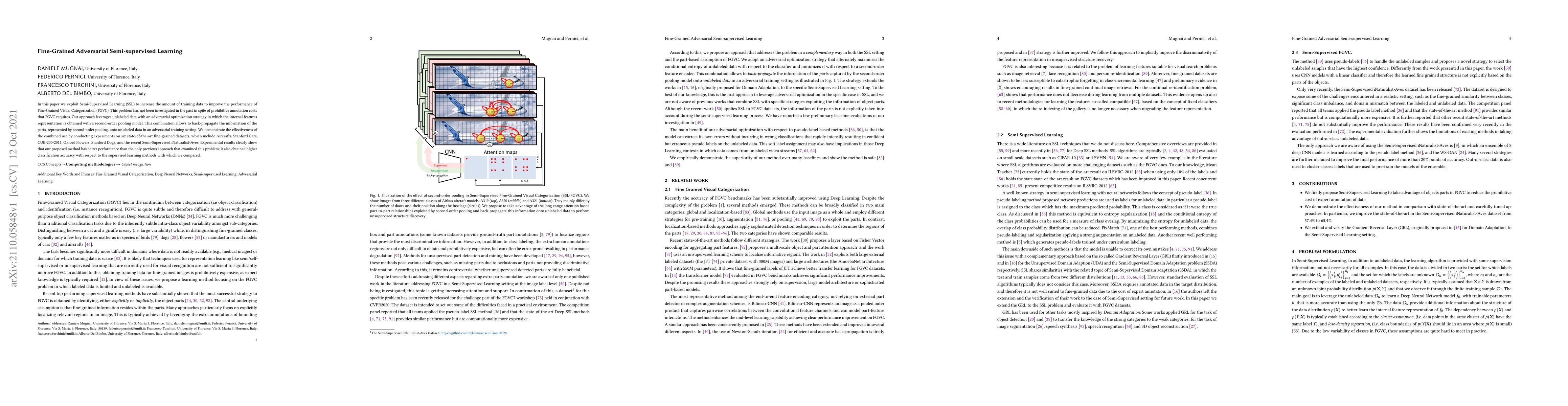 This paper proposes a semi-supervised learning approach using adversarial optimization and second-order pooling to enhance fine-grained visual categorization, achieving superior performance compared to previous methods and supervised learning baselines on six fine-grained datasets.