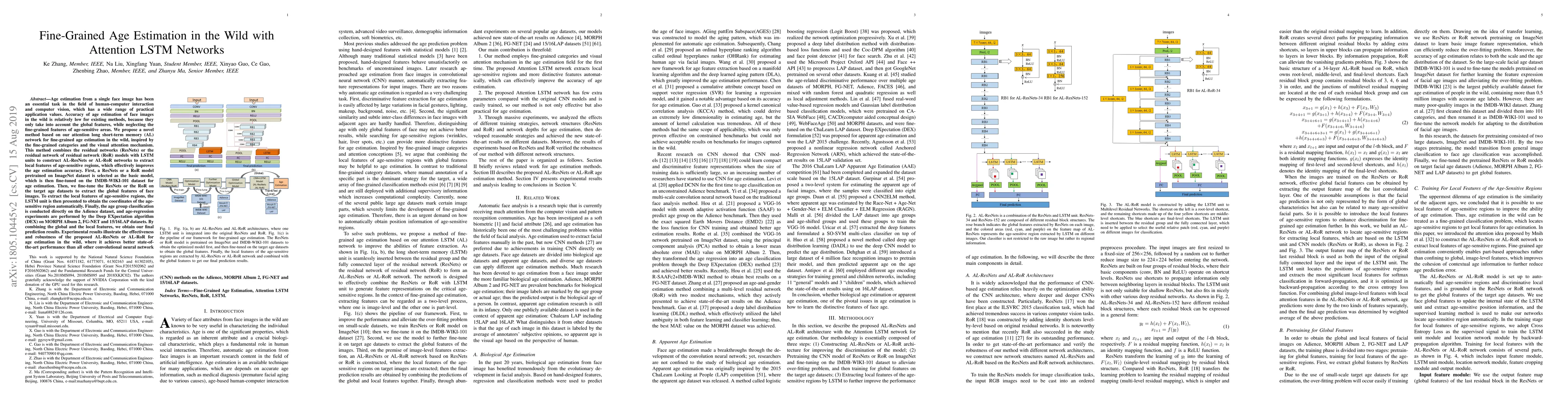 This paper proposes an attention long short-term memory (AL) network for fine-grained age estimation in natural settings, combining ResNets or RoR models with LSTM units to extract local features of age-sensitive regions, improving accuracy over existing global feature-based methods. Experimental results show superior performance compared to other convolutional neural networks.
