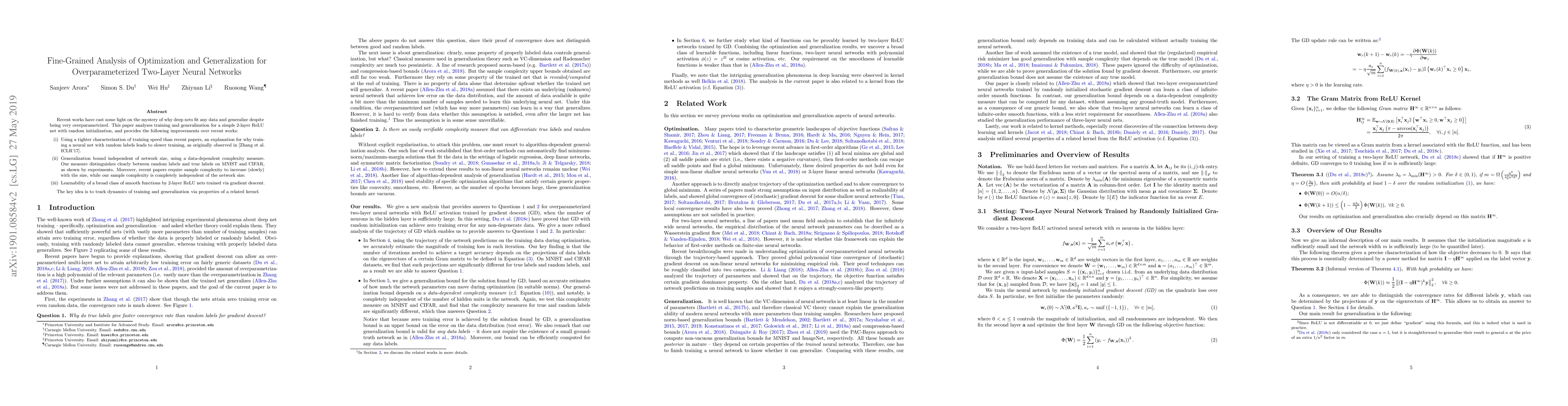 Recent works have cast some light on the mystery of why deep nets fit any data and generalize despite being very overparametrized. This paper analyzes training and generalization for a simple 2-layer ReLU net with random initialization, and provides the following improvements over recent works: (i) Using a tighter characterization of training speed than recent papers, an explanation for why training a neural net with random labels leads to slower training, as originally observed in [Zhang et al. ICLR'17]. (ii) Generalization bound independent of network size, using a data-dependent complexity measure. Our measure distinguishes clearly between random labels and true labels on MNIST and CIFAR, as shown by experiments. Moreover, recent papers require sample complexity to increase (slowly) with the size, while our sample complexity is completely independent of the network size. (iii) Learnability of a broad class of smooth functions by 2-layer ReLU nets trained via gradient descent. The key idea is to track dynamics of training and generalization via properties of a related kernel.