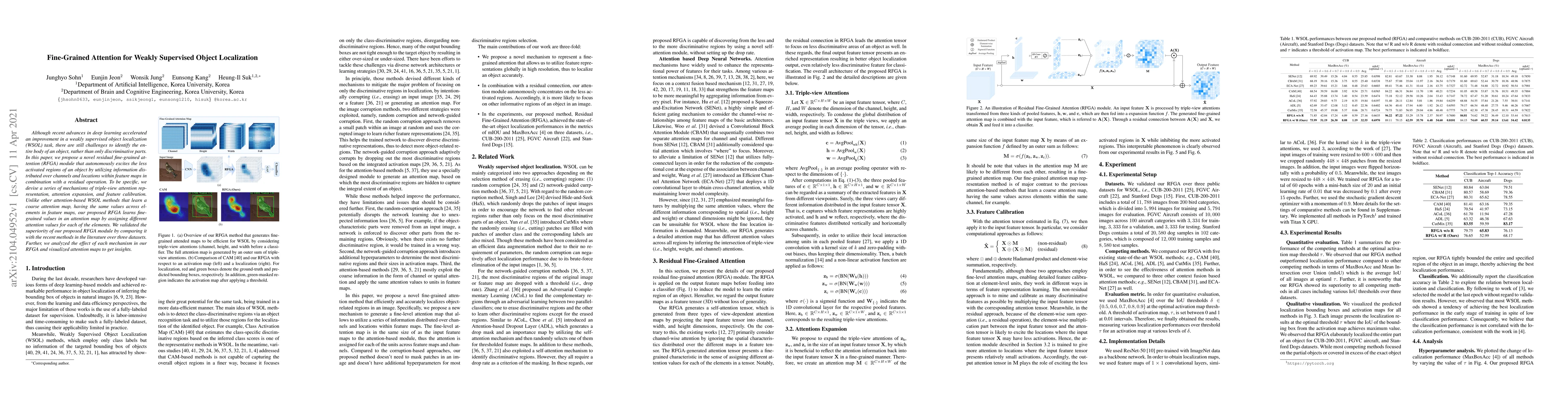 This paper introduces a novel residual fine-grained attention (RFGA) module to enhance weakly supervised object localization by focusing on less activated regions of objects. The RFGA module employs triple-view attention, attention expansion, and feature calibration to generate fine-grained attention maps, outperforming existing coarse attention methods and demonstrating superior performance across three datasets.