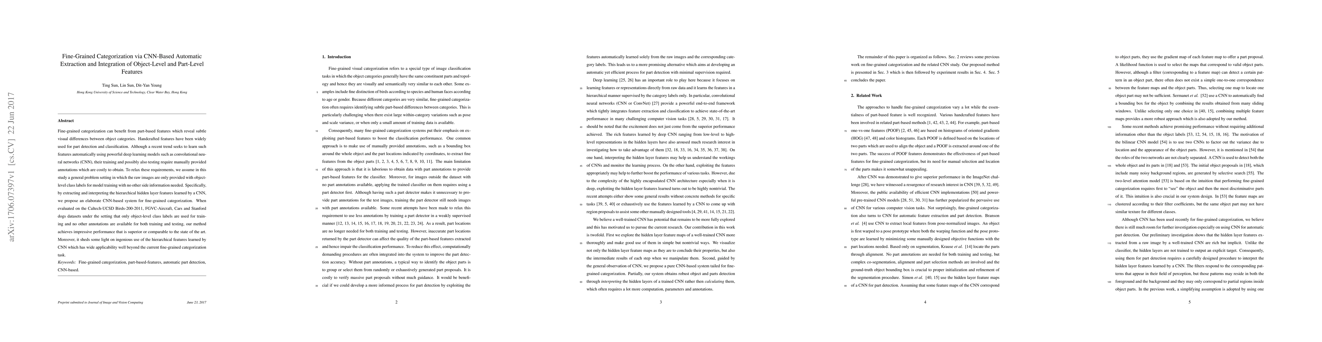This paper proposes a CNN-based system for fine-grained categorization using only object-level class labels, leveraging hierarchical features learned by CNNs to extract and integrate both object-level and part-level features without requiring manual annotations. The method achieves state-of-the-art or comparable performance on several fine-grained datasets.
