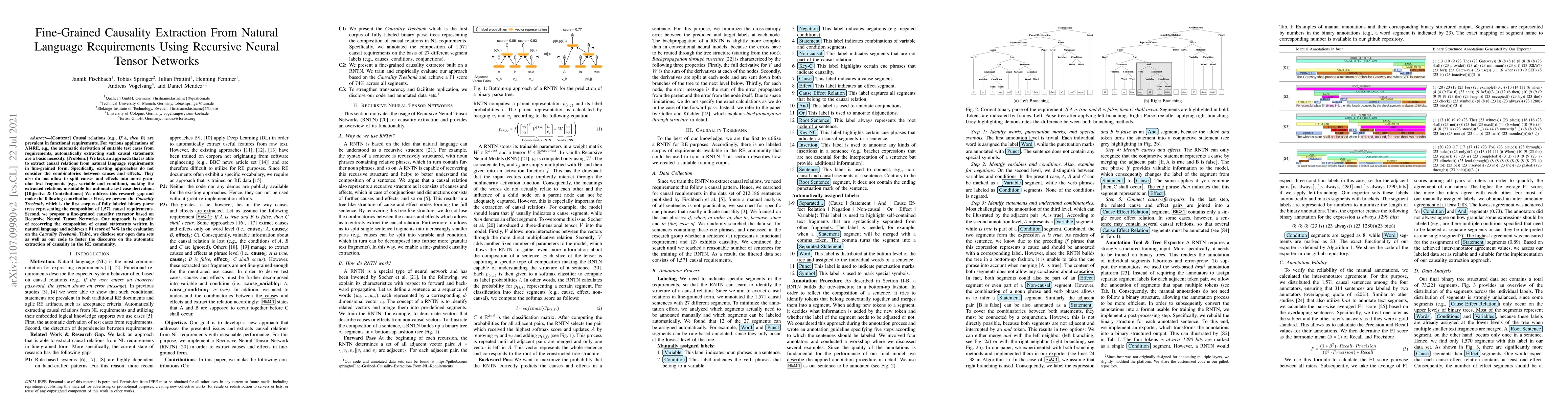 This paper introduces a novel approach for extracting fine-grained causal relationships from natural language requirements using Recursive Neural Tensor Networks. It presents the Causality Treebank, a new labeled dataset, and achieves a F1 score of 74% in evaluating the proposed extractor, addressing the lack of granular causal relation extraction in existing methods.