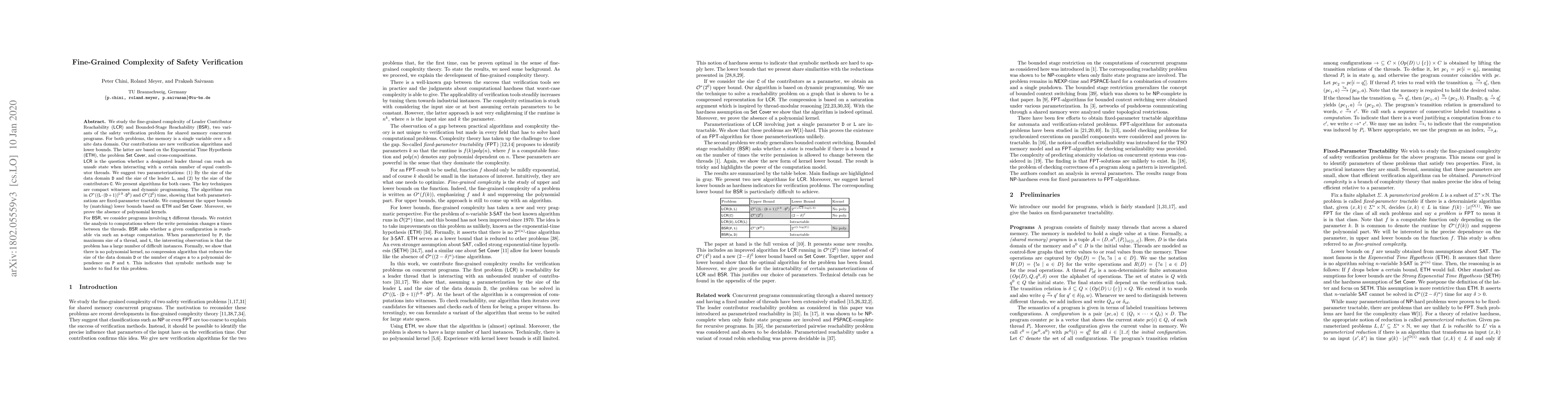 We study the fine-grained complexity of Leader Contributor Reachability (LCR) and Bounded-Stage Reachability (BSR), two variants of the safety verification problem for shared memory concurrent programs. For both problems, the memory is a single variable over a finite data domain. Our contributions are new verification algorithms and lower bounds. The latter are based on the Exponential Time Hypothesis (ETH), the problem Set Cover, and cross-compositions. LCR is the question whether a designated leader thread can reach an unsafe state when interacting with a certain number of equal contributor threads. We suggest two parameterizations: (1) By the size of the data domain D and the size of the leader L, and (2) by the size of the contributors C. We present algorithms for both cases. The key techniques are compact witnesses and dynamic programming. The algorithms run in O*((L(D+1))^(LD) * D^D) and O*(2^C) time, showing that both parameterizations are fixed-parameter tractable. We complement the upper bounds by (matching) lower bounds based on ETH and Set Cover. Moreover, we prove the absence of polynomial kernels. For BSR, we consider programs involving t different threads. We restrict the analysis to computations where the write permission changes s times between the threads. BSR asks whether a given configuration is reachable via such an s-stage computation. When parameterized by P, the maximum size of a thread, and t, the interesting observation is that the problem has a large number of difficult instances. Formally, we show that there is no polynomial kernel, no compression algorithm that reduces the size of the data domain D or the number of stages s to a polynomial dependence on P and t. This indicates that symbolic methods may be harder to find for this problem.