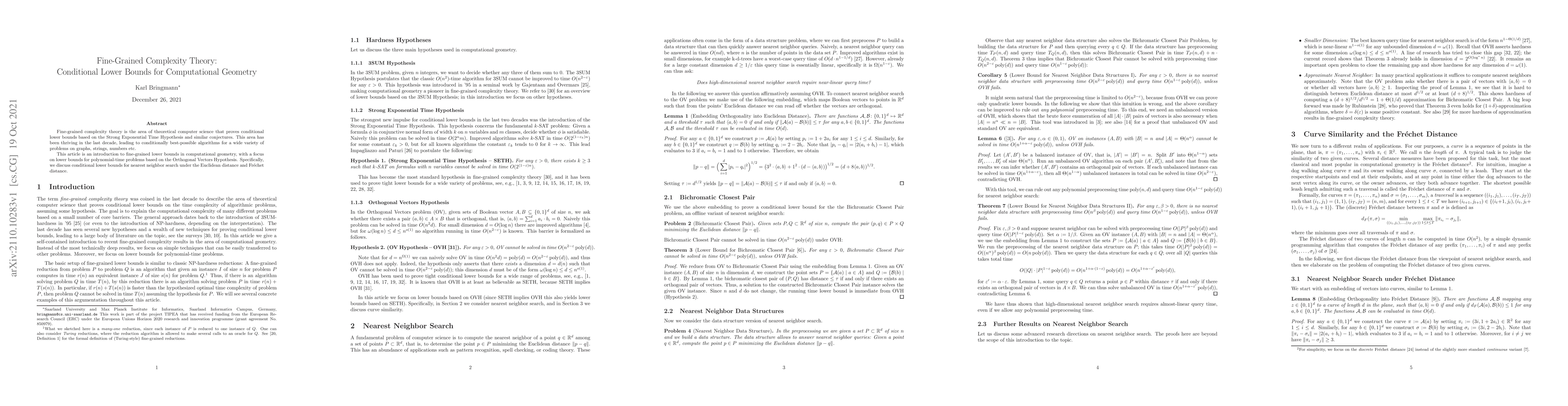 This paper introduces fine-grained complexity theory, emphasizing conditional lower bounds for computational geometry problems, particularly focusing on nearest neighbor search under Euclidean and Fréchet distances based on the Orthogonal Vectors Hypothesis. It highlights the significance of these bounds within the context of the Strong Exponential Time Hypothesis.