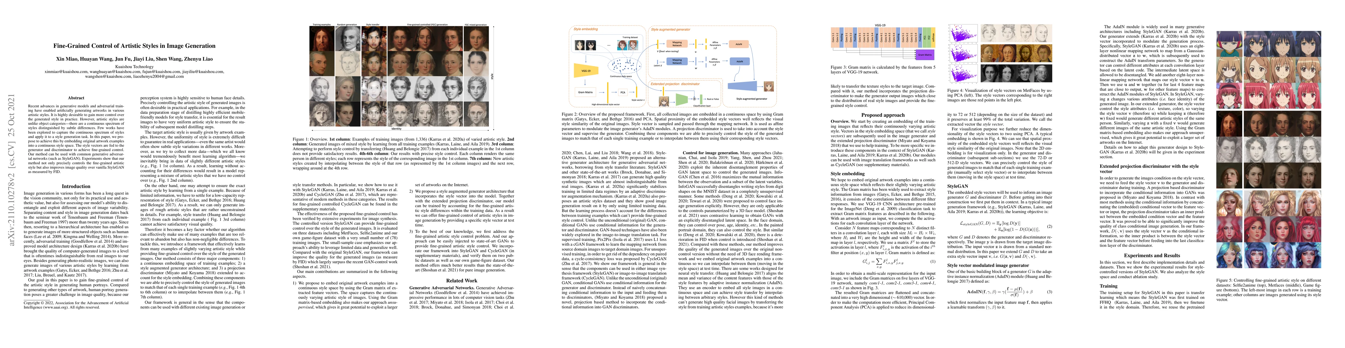 This research is significant as it addresses the fine-grained artistic style control problem for the first time, offering an unsupervised approach that not only provides precise style control but also enhances image quality. The ability to generate high-quality images with precise style control from a small number of training examples has potential applications in online social entertainment, such as real-time style transfer of selfies on mobile phones.